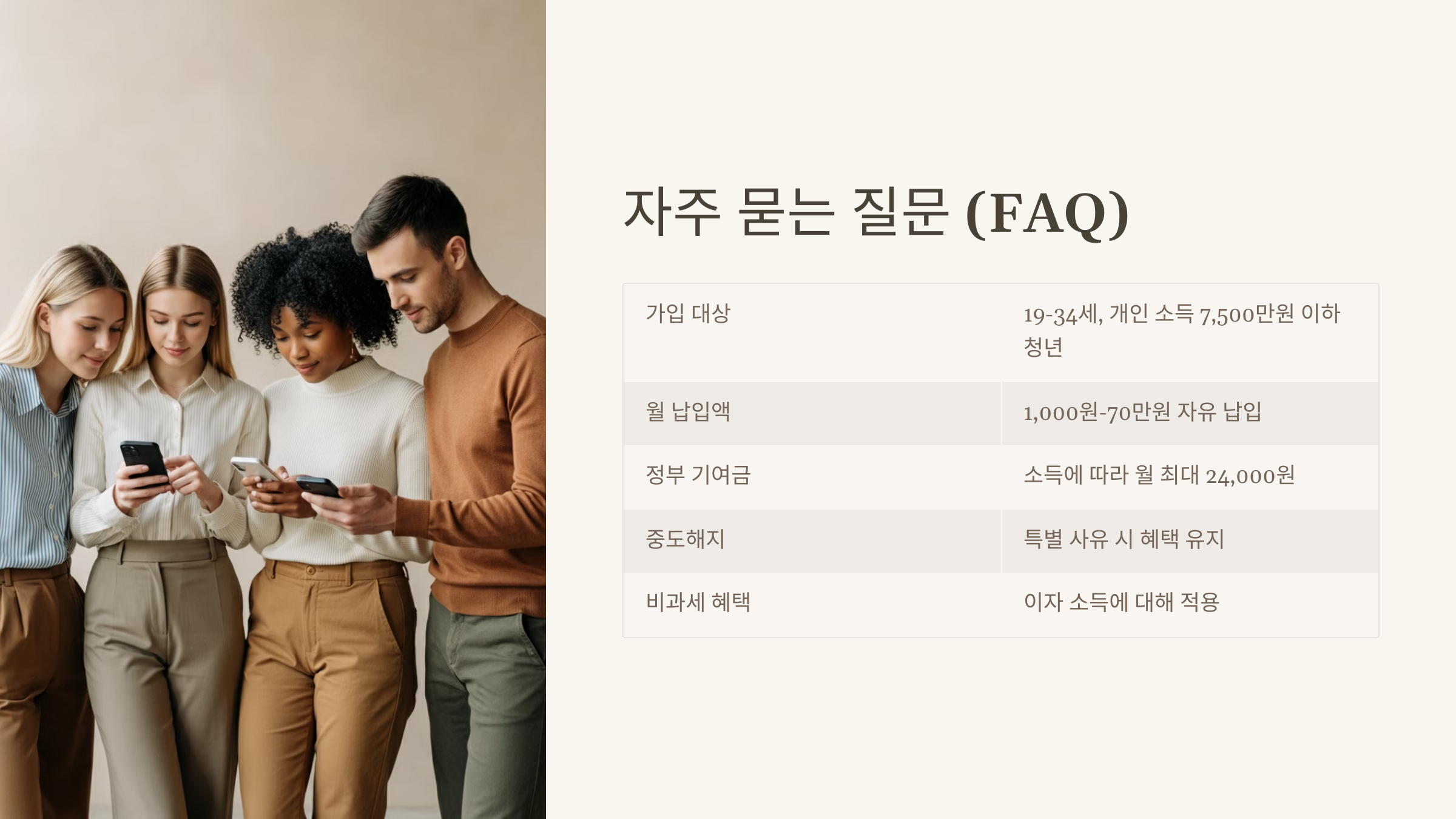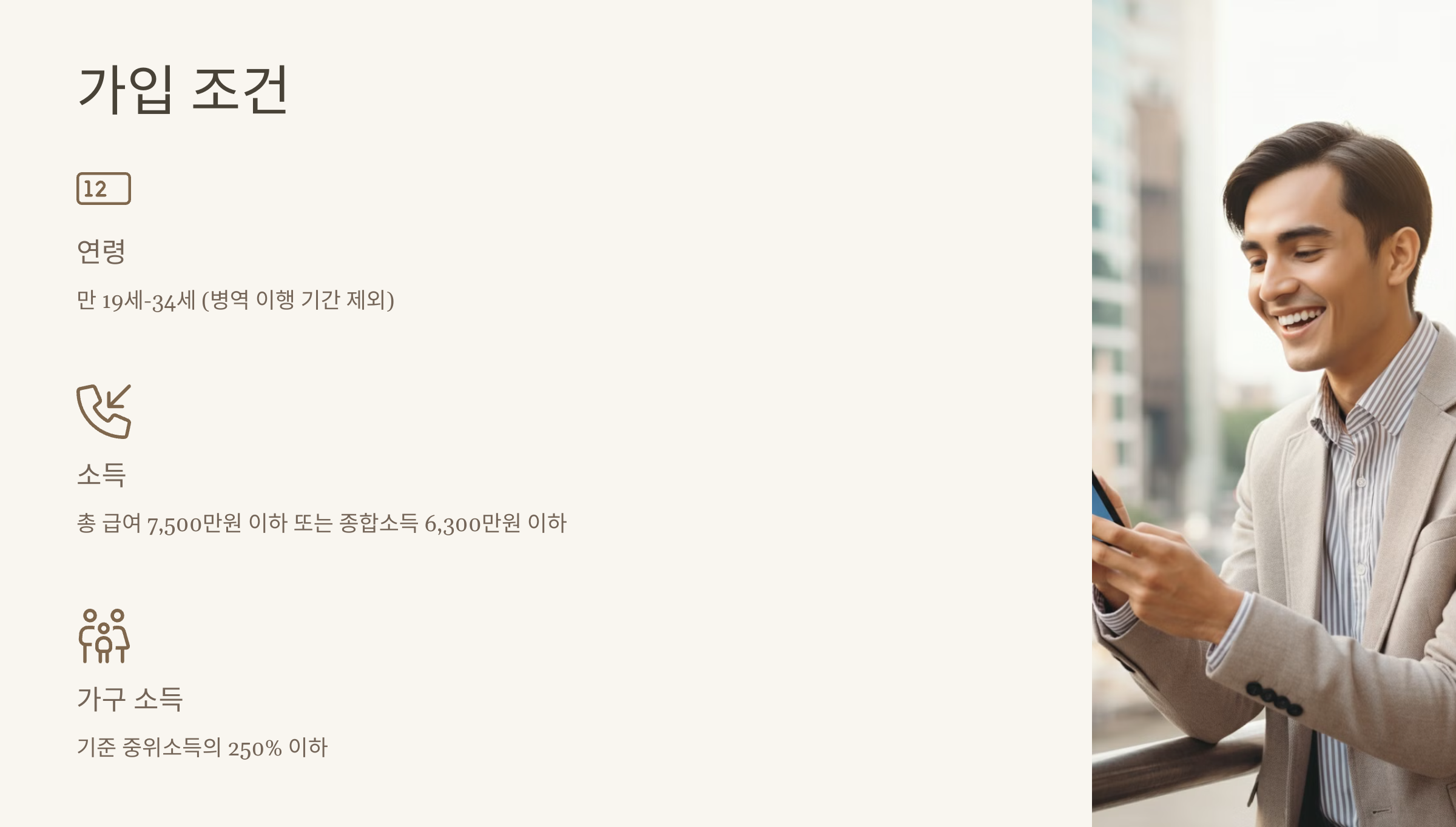 • 병역 이행자: 병역 이행 기간(최대 6년)은 연령 계산 시 제외되어 만 34세를 초과해도 가입 가능합니다.