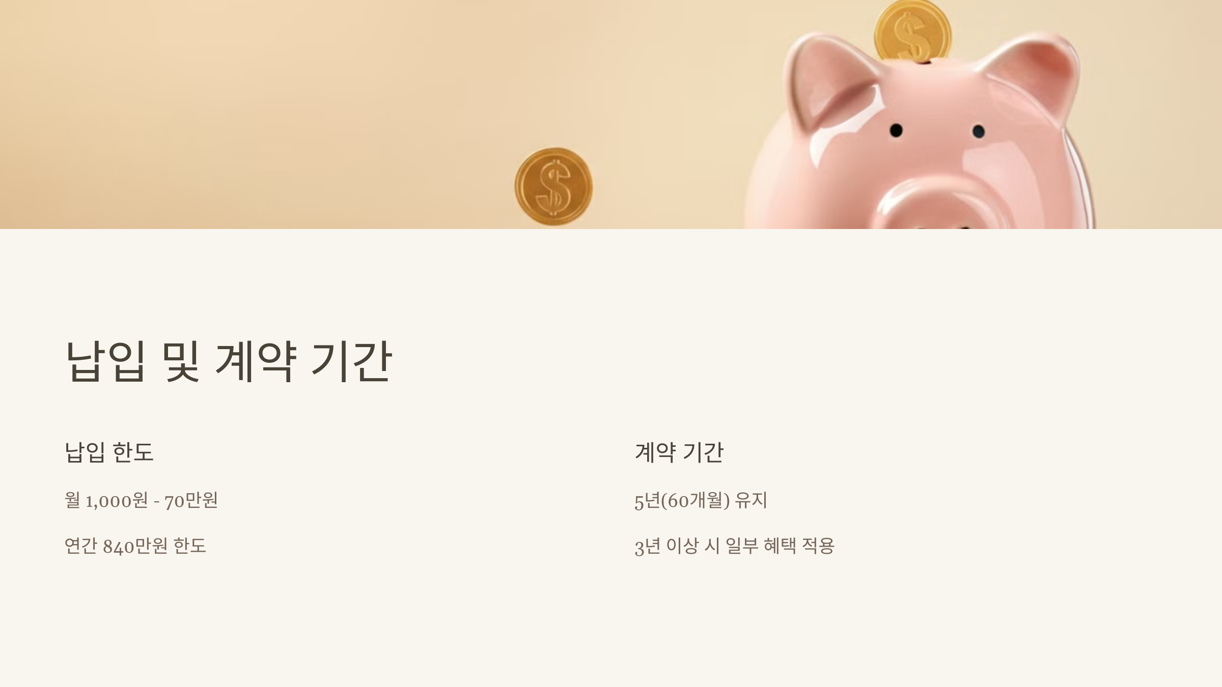 • 계약 기간: 5년(60개월) 동안 유지해야 하며, 3년 이상 유지 시 일부 혜택이 적용됩니다.