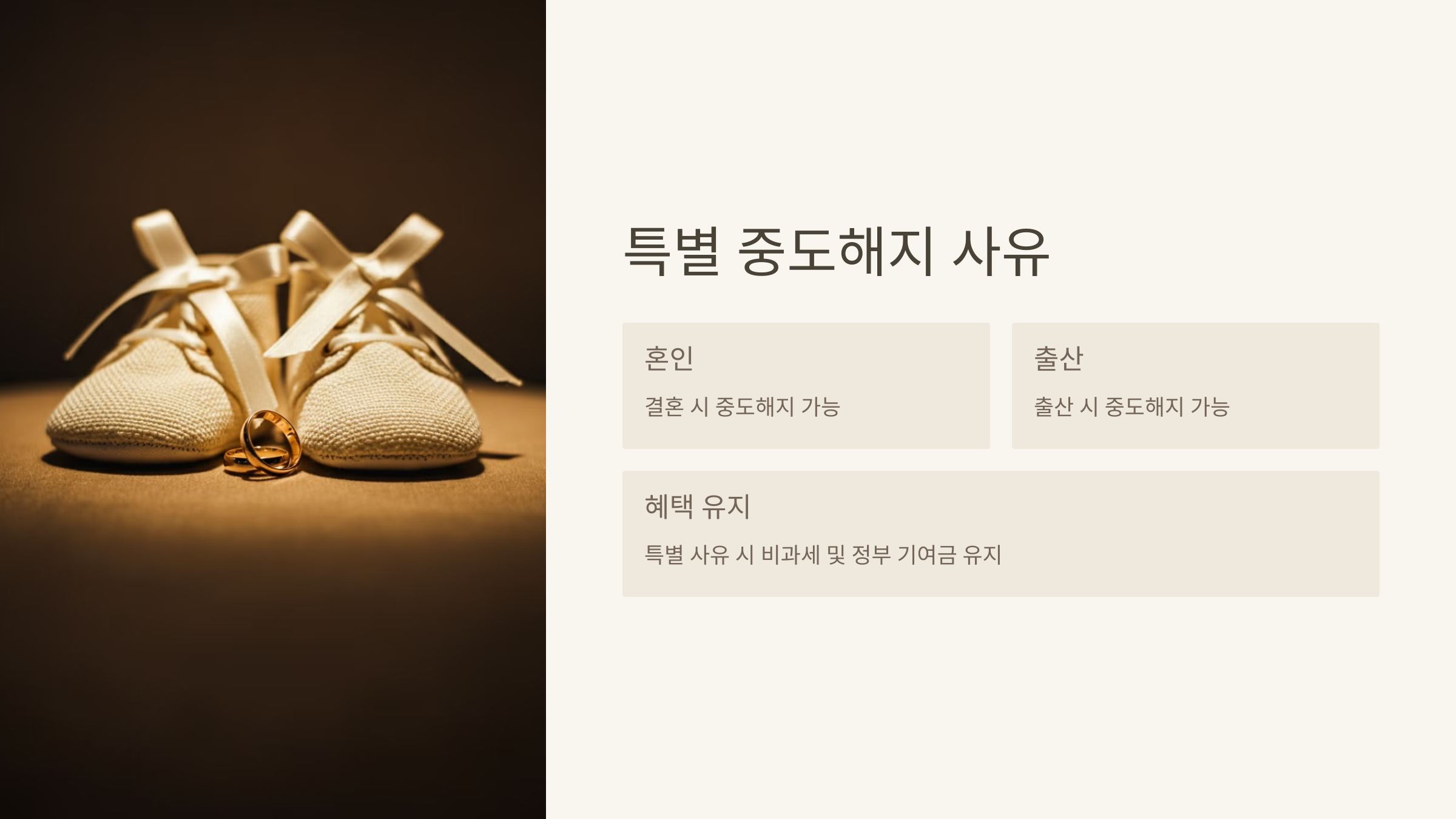 2024년부터 혼인 및 출산이 특별 중도해지 사유에 포함되어, 이러한 경우 중도해지 시에도 비과세 혜택과 정부 기여금을 받을 수 있습니다.