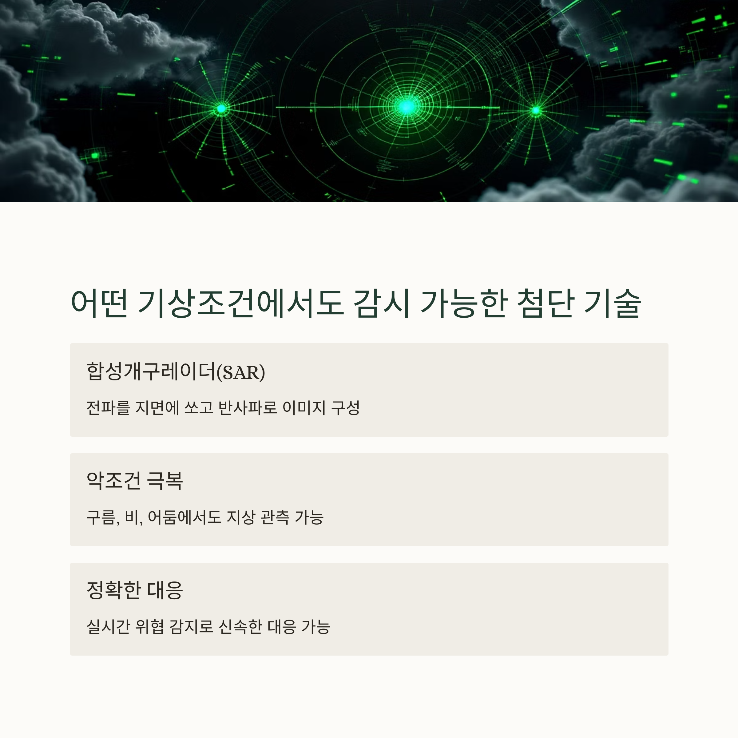2. 합성개구레이더(SAR) 탑재: 모든 기상조건에서도 감시 가능