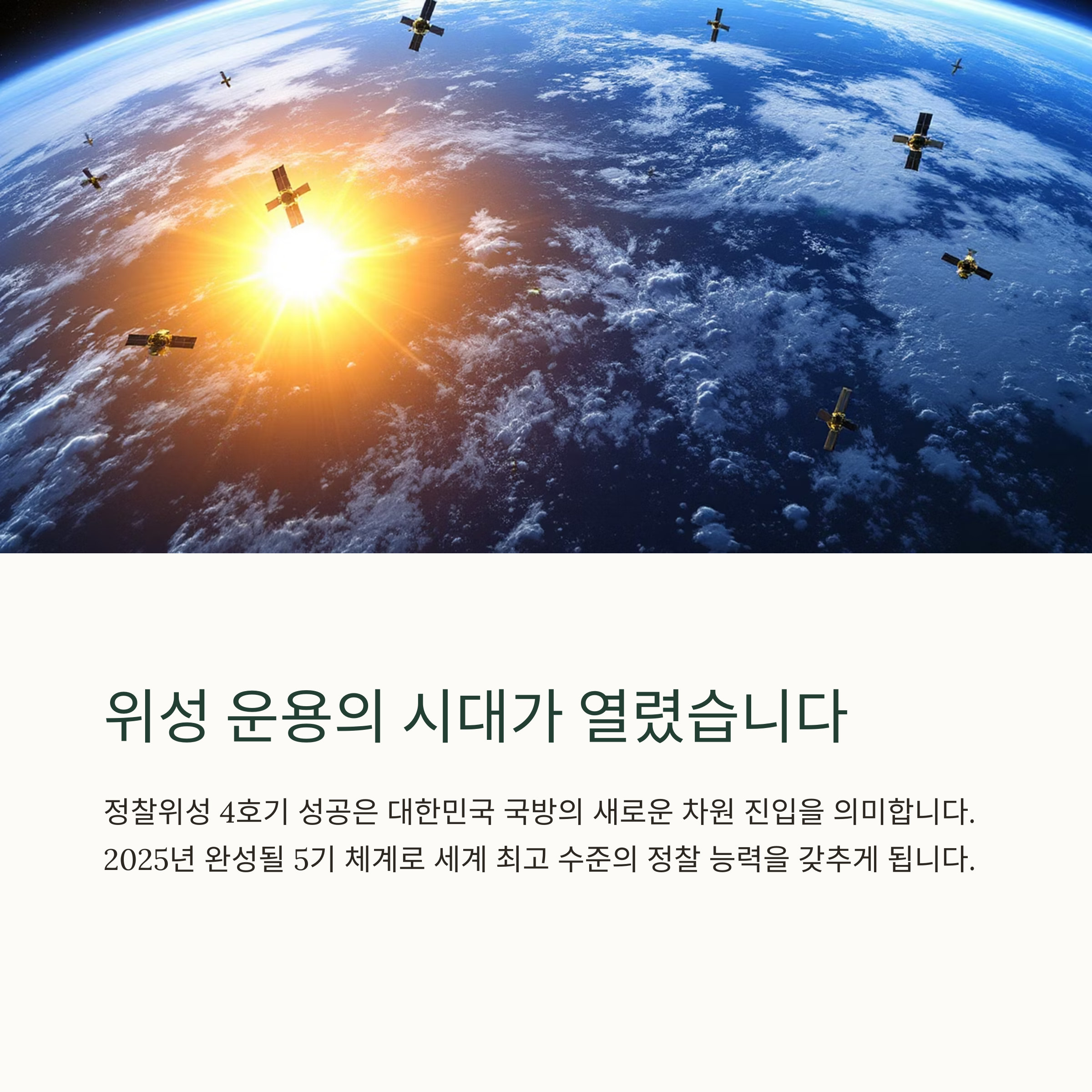 정찰위성 4호기의 성공은 단순한 기술적 쾌거를 넘어, 대한민국 국방이 새로운 차원으로 진입하고 있다는 명백한 증거입니다. 이제는 몇 개의 위성을 보유하느냐보다, 그것들을 얼마나 전략적으로 ‘운용’하느냐가 국가 안보의 열쇠가 되고 있습니다.