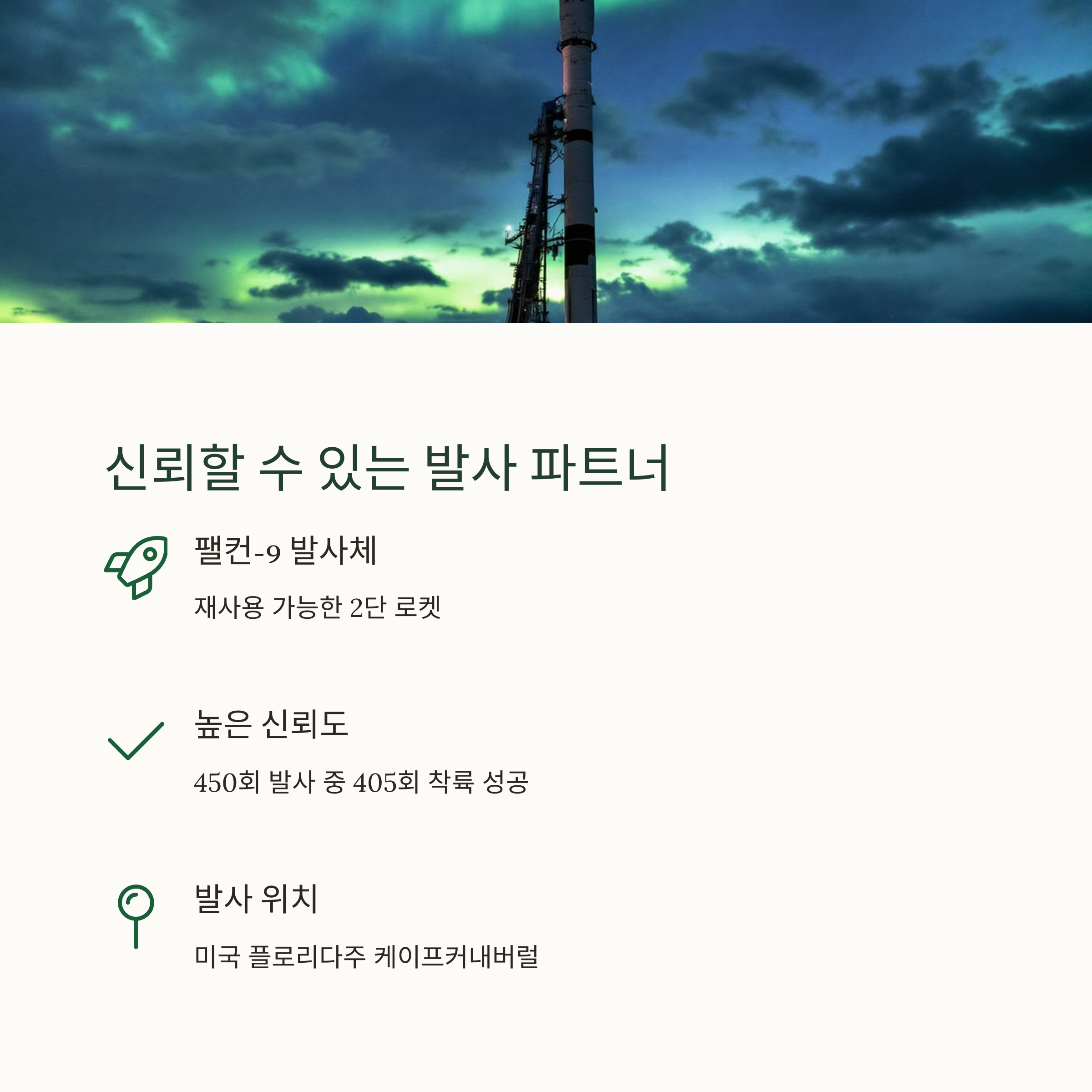 이번 위성은 미국 플로리다주 케이프커내버럴 우주군 기지에서 스페이스X의 팰컨-9 발사체를 통해 발사되었습니다. 팰컨-9은 재사용 가능한 2단 로켓으로, 2025년 기준 총 450회 발사 중 405회의 착륙 성공이라는 높은 신뢰도를 자랑합니다. 이는 대한민국 위성 발사의 성공률 제고와 발사 비용 절감에도 긍정적 영향을 미칩니다.