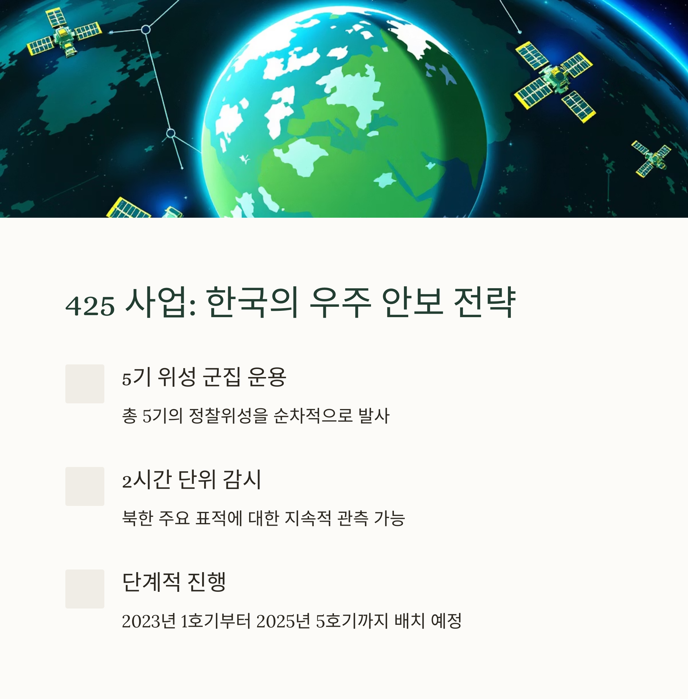 이번 위성은 국방부의 ‘425 사업’ 일환으로 추진되고 있으며, 그 기술력과 운용 전략은 한국의 정찰 능력을 크게 강화하는 계기가 될 것입니다.