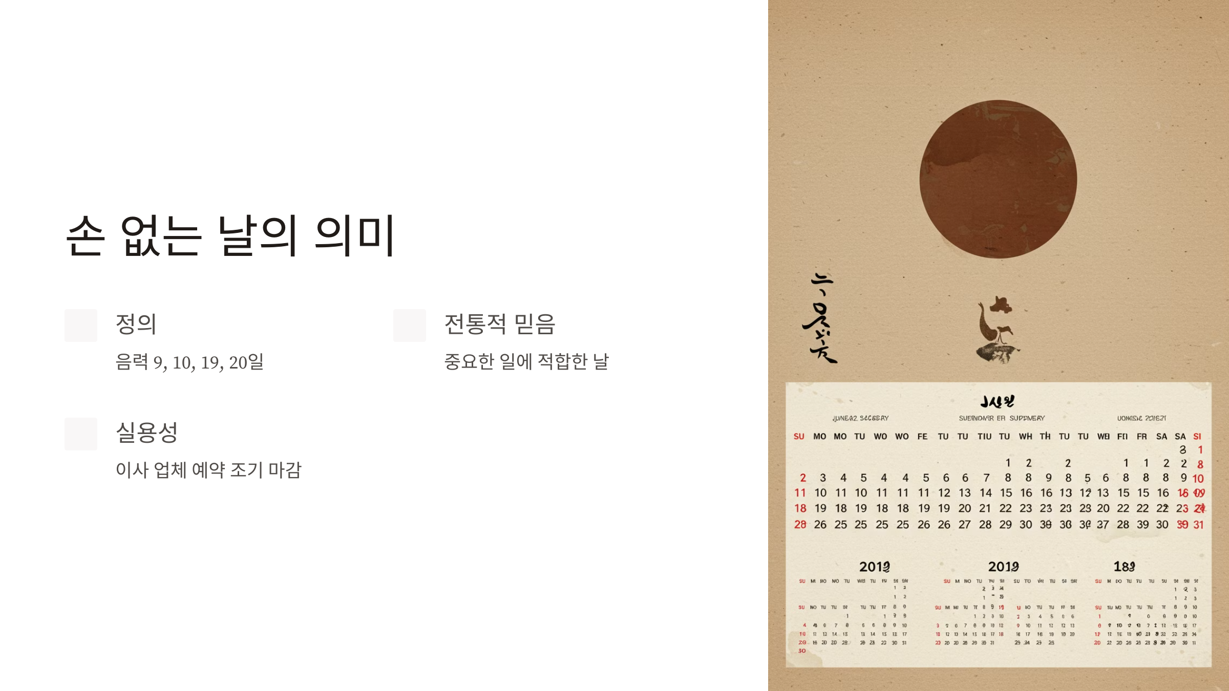 손 없는 날은 음력으로 매월 9, 10, 19, 20일에 해당합니다. 이 날은 귀신이 활동하지 않는 날로 전해집니다.