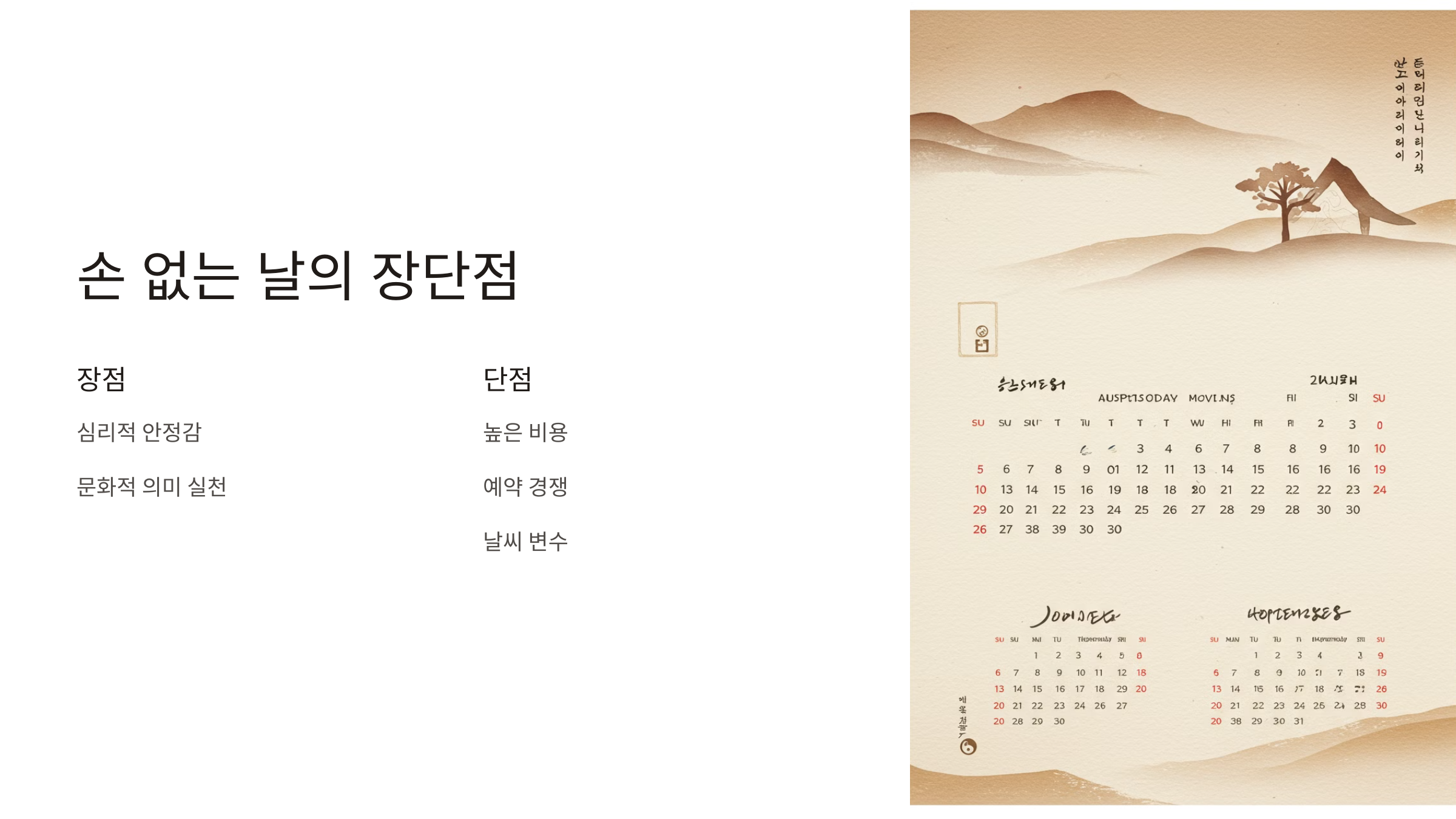 - 예약 경쟁: 손 없는 날은 이사뿐만 아니라 결혼식, 개업 등 다양한 이벤트가 몰려 있어 일정 조율이 어렵습니다.