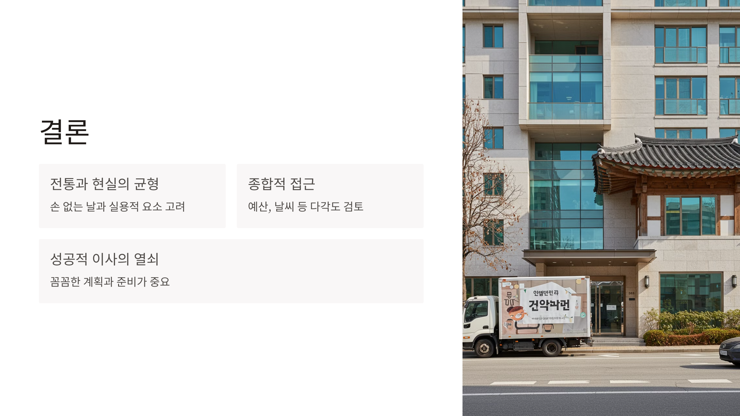 손 없는 날을 고집하지 않아도 괜찮습니다. 대신 철저한 계획과 준비로 이사를 순조롭게 진행할 수 있습니다.