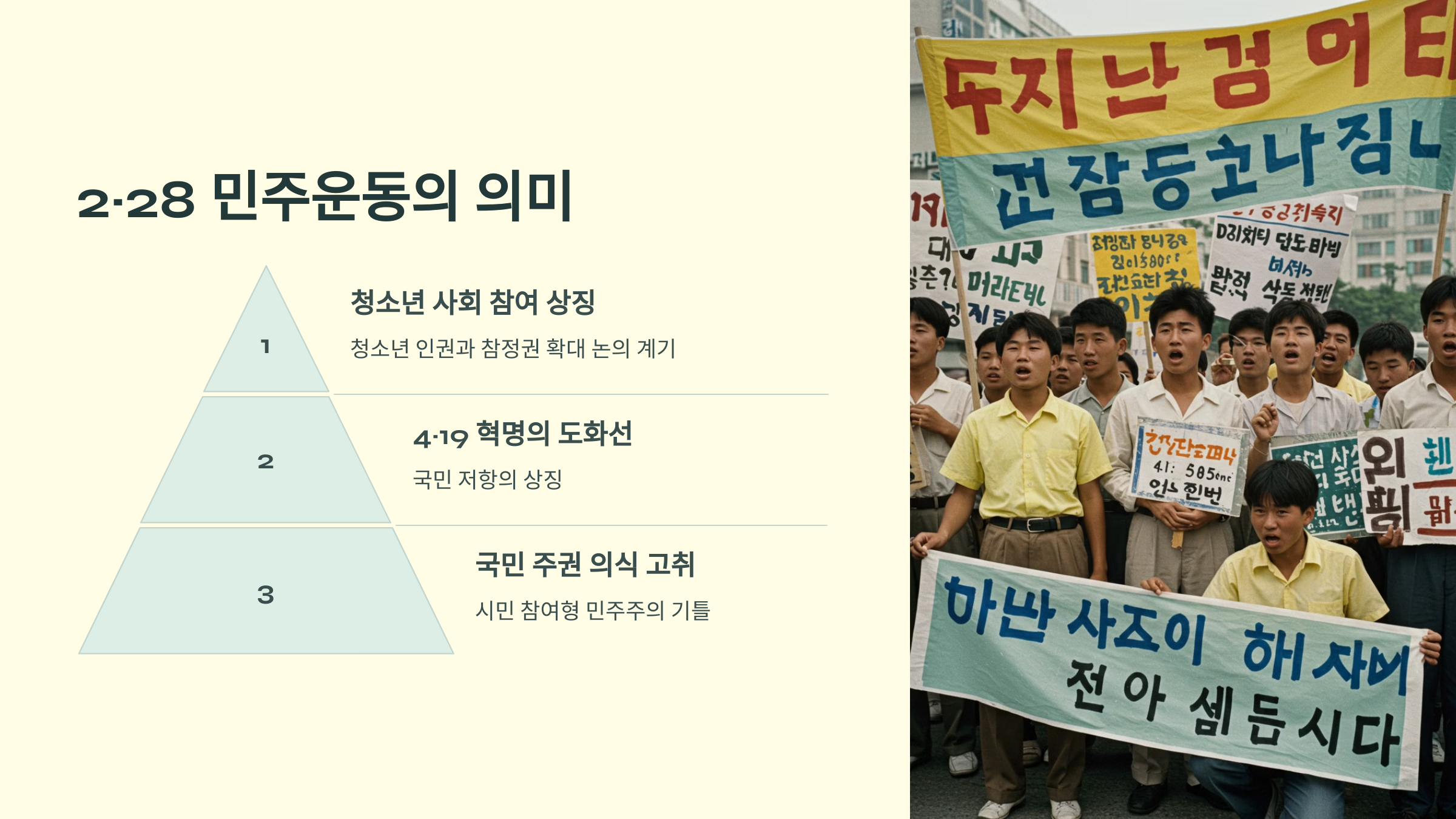 2·28 민주운동은 대한민국 민주주의의 큰 변곡점을 만든 사건입니다. 학생들의 작은 외침이 전국적인 민주화 열기로 번졌고, 결국 4·19 혁명으로 이어져 독재 정권의 종말을 가져왔습니다.