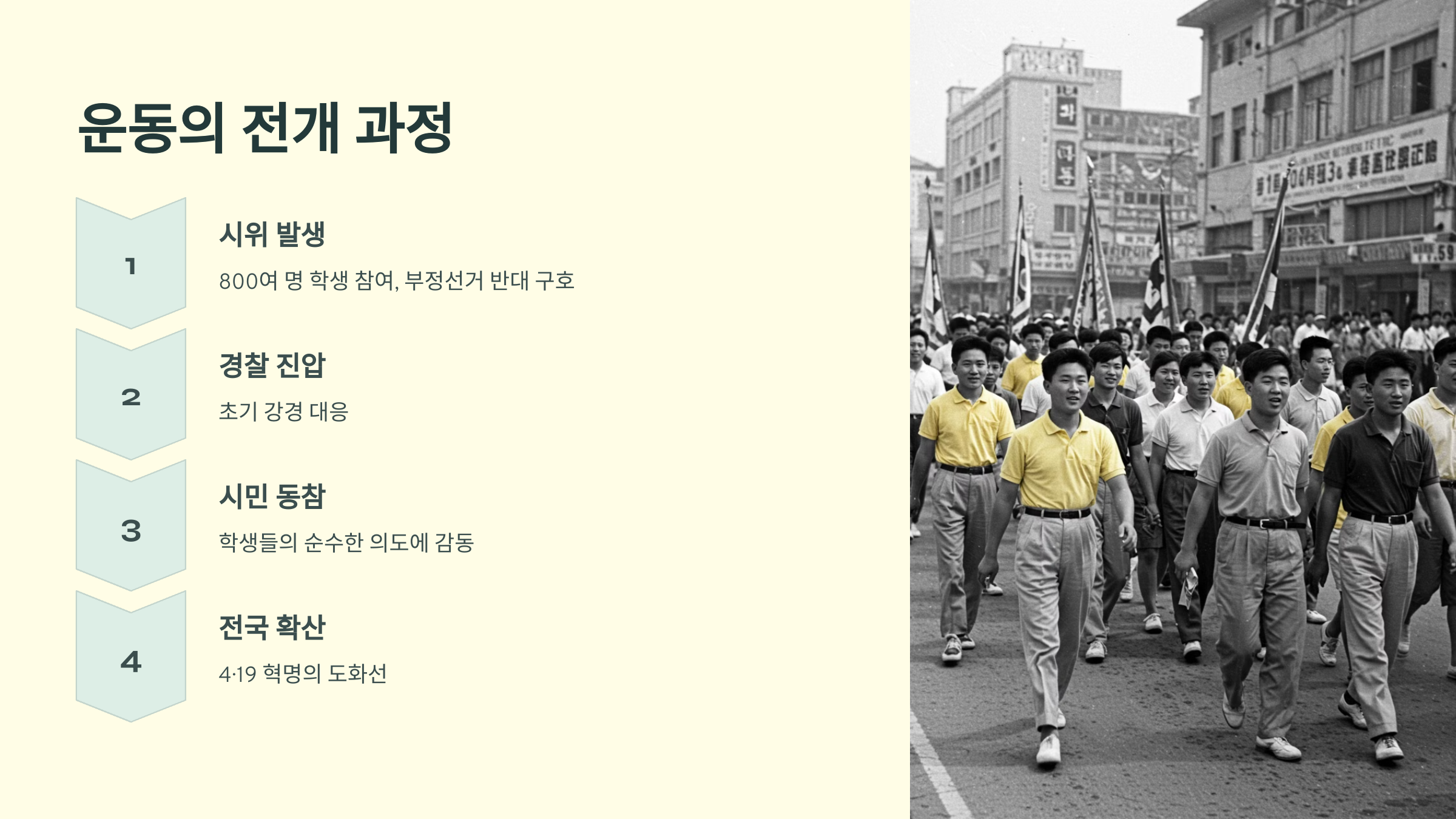 처음에는 경찰의 강경 진압이 있었지만, 학생들의 순수한 의도와 용기에 시민들이 감동하여 시위에 동참하기 시작했습니다. 이 사건은 언론과 전국으로 빠르게 퍼져나가며, 4·19 혁명의 직접적인 도화선이 되었습니다.