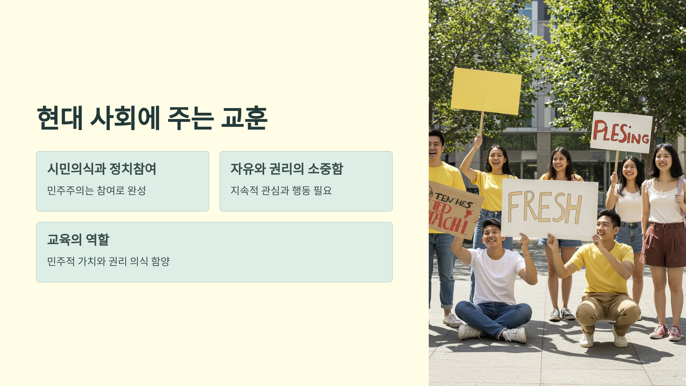 민주주의는 참여를 통해 완성됩니다. 당시 학생들의 용기 있는 행동은 현재 국민들의 선거 참여와 시민 운동에 큰 영향을 주었습니다.
