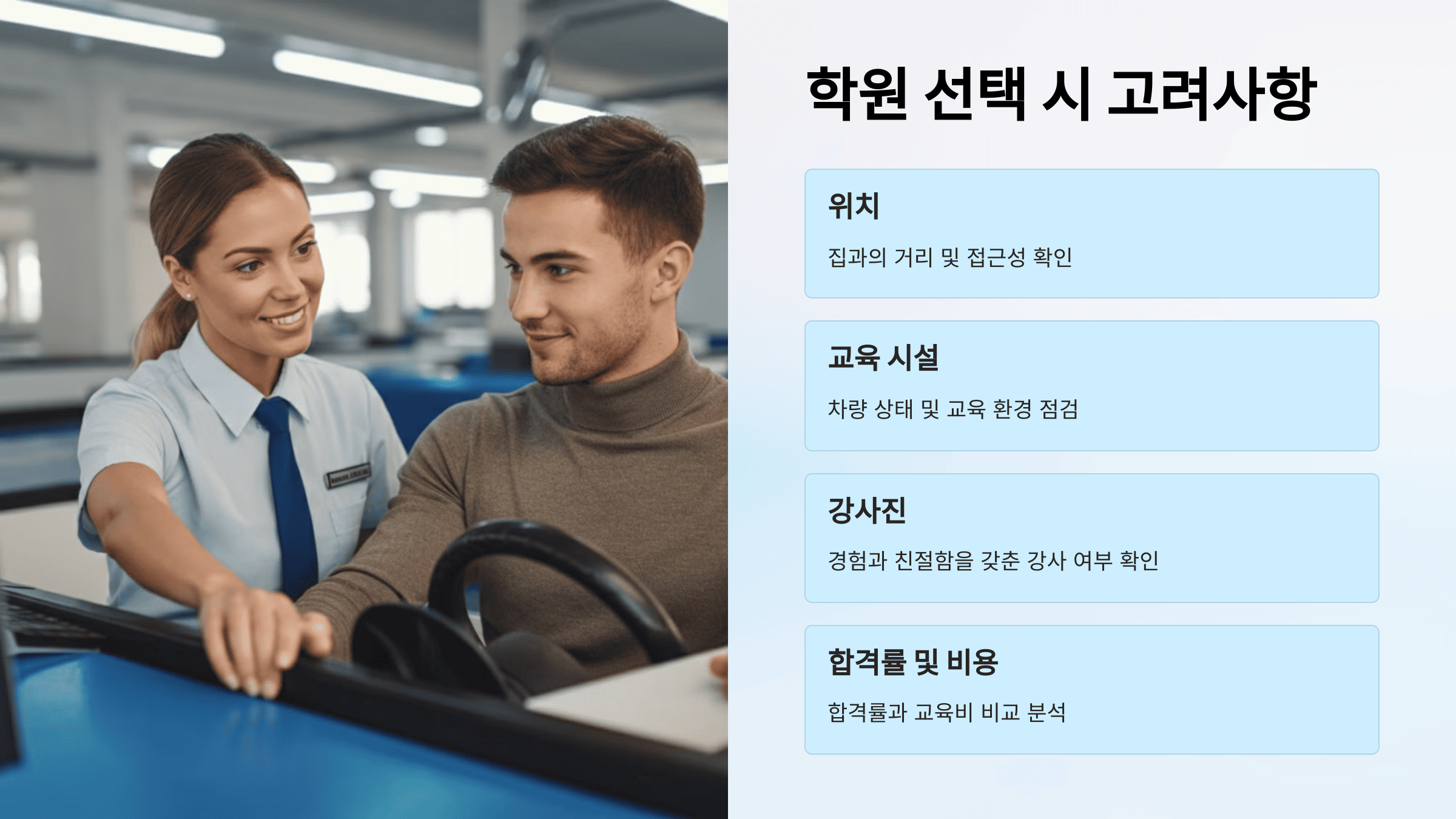 • 충분한 연습: 차량 조작이 익숙하지 않을 수 있으므로, 학원에서 제공하는 교육 시간을 충분히 활용하여 연습하세요.