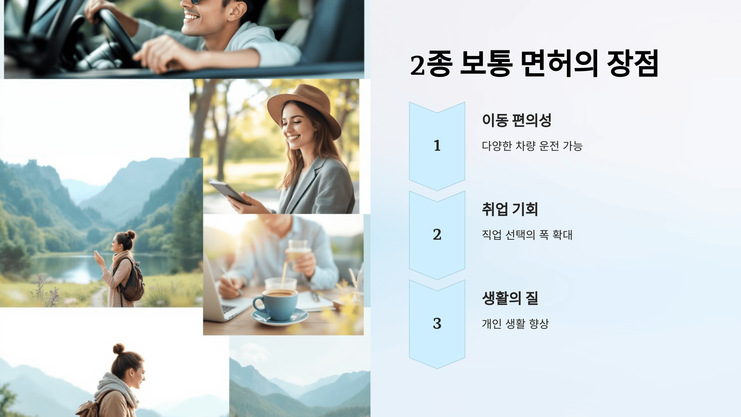 2종 보통 운전면허는 다양한 차량을 운전할 수 있는 자격을 부여하여 개인의 이동 편의성과 취업 기회를 확대해줍니다. 자격 요건을 충족하고, 체계적인 준비를 통해 면허를 취득하시길 바랍니다. 안전한 운전 생활을 위해 항상 교통법규를 준수하고, 지속적인 연습과 학습을 이어가세요.