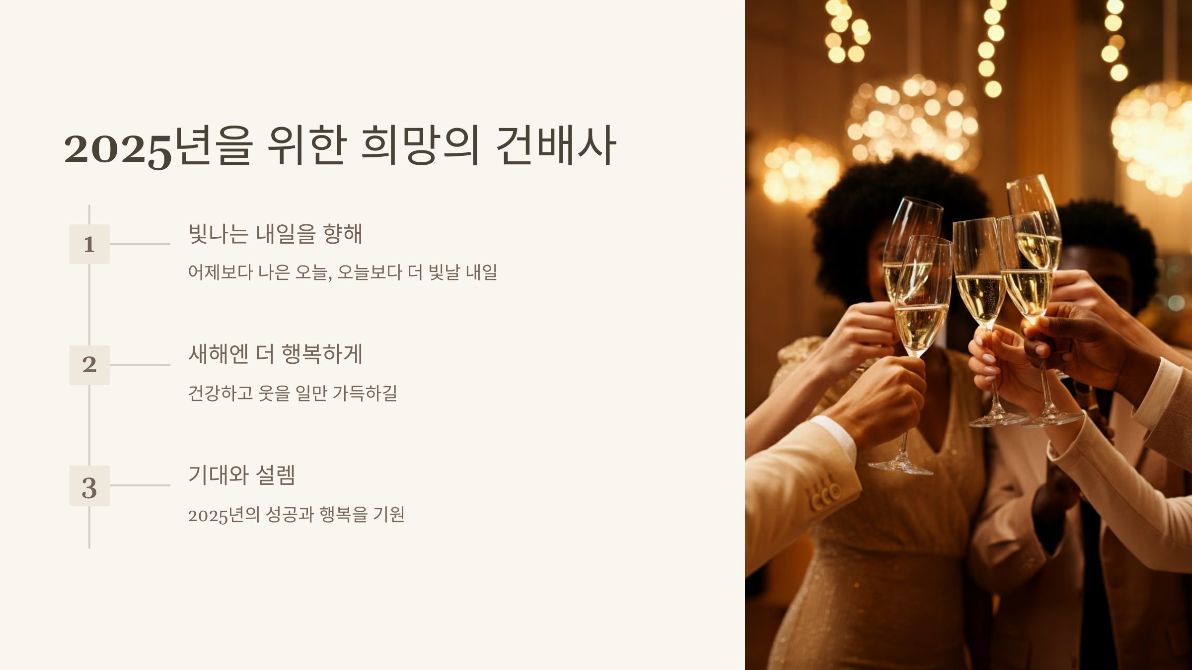 새로운 한 해는 늘 기대와 설렘을 안겨줍니다. 다가올 2025년의 성공과 행복을 기원하며 나눈 건배사들입니다.