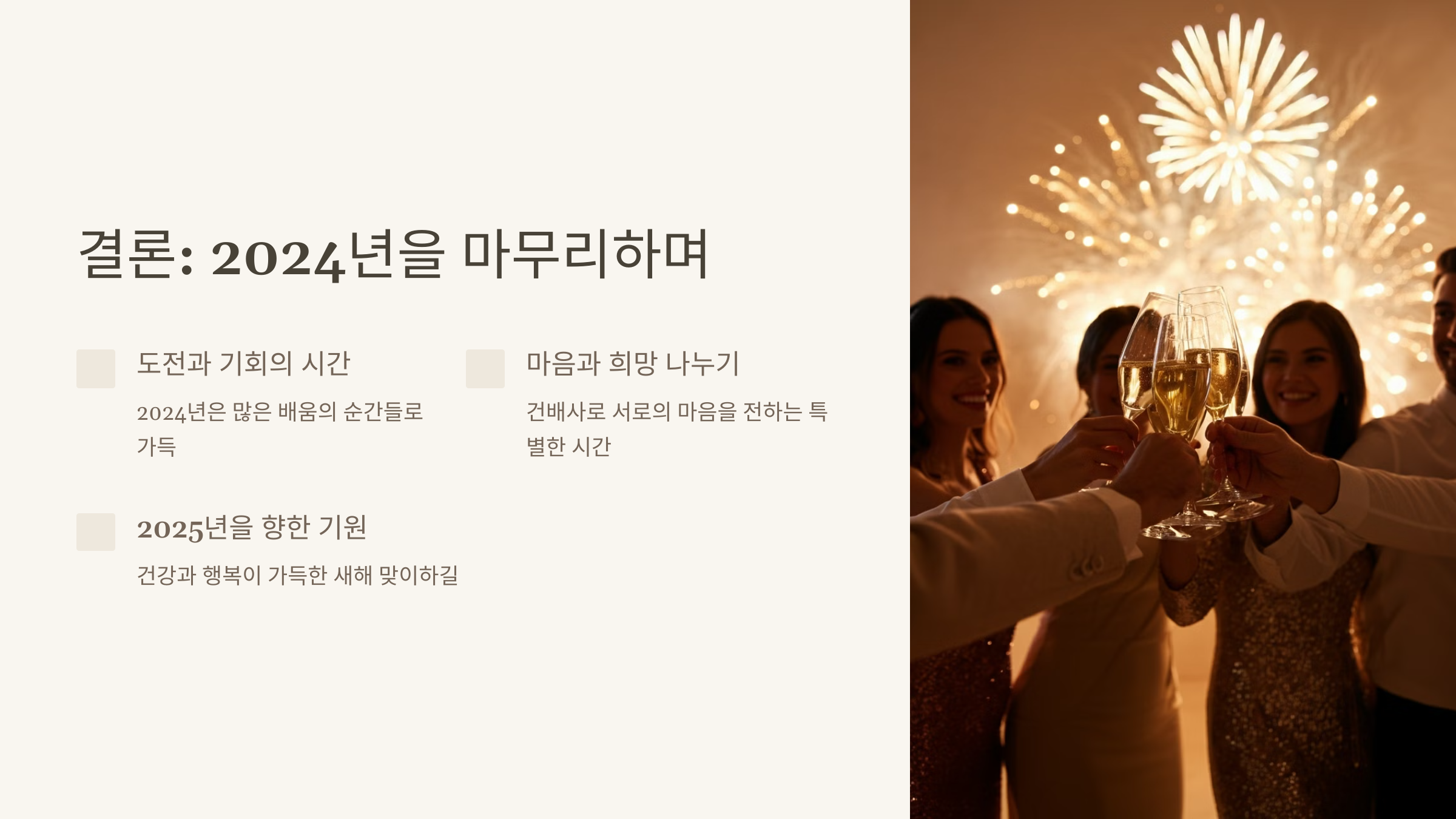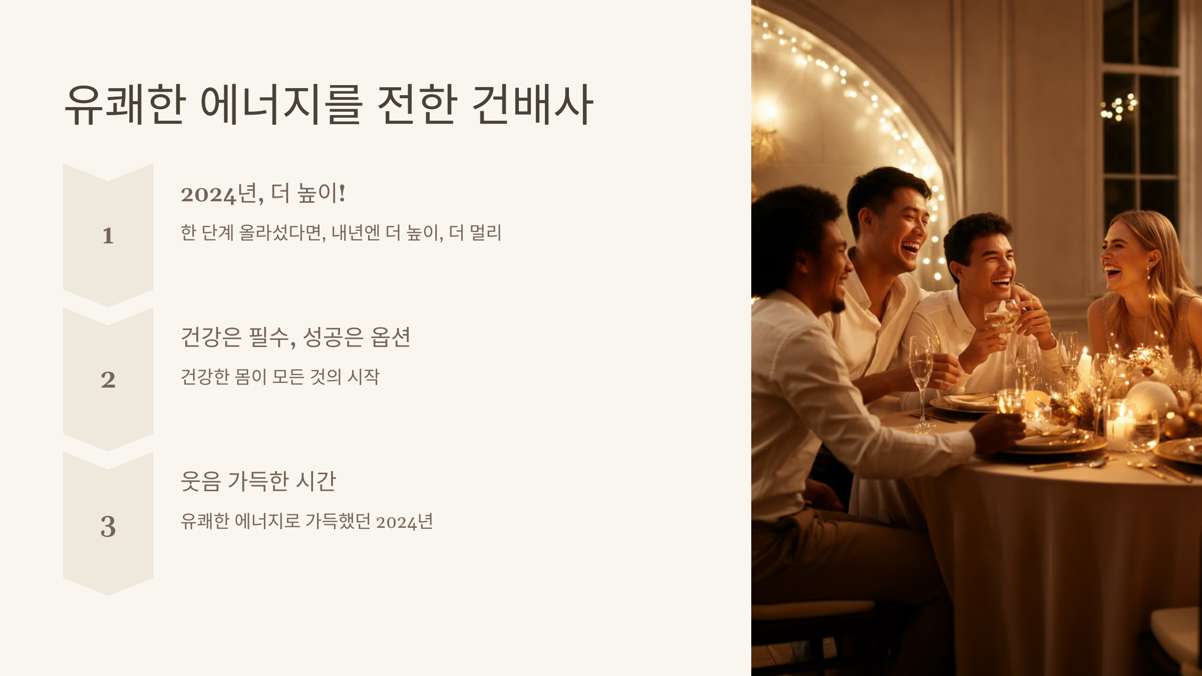 2024년은 도전과 기회, 그리고 많은 배움의 시간이었습니다. 우리가 나눈 건배사는 단순한 음료를 나누는 것이 아니라, 마음을 나누고 희망을 전하는 시간이었습니다. 2025년에도 우리 모두가 건강과 행복으로 가득한 나날을 보내길 기원합니다. 여러분 모두에게, 건배! 🥂