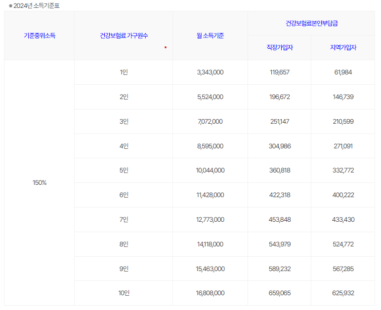 ※ 소득은 2024년 7월 건강보험료 고지 금액 기준으로 중위소득 150%이하(1인 가구 3,343,000원)
