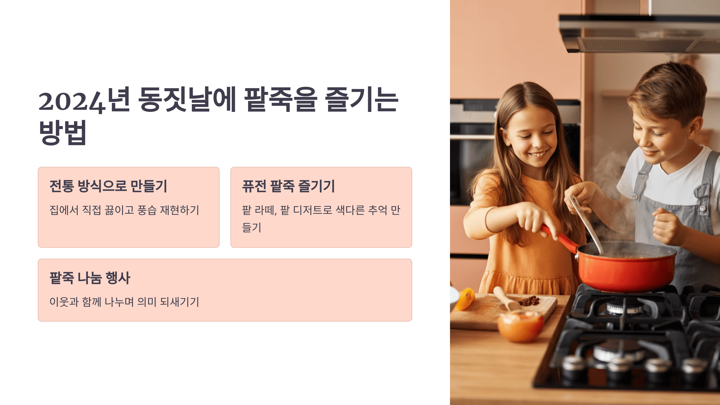 올해 동짓날에는 팥죽의 전통적 의미를 되새기며, 현대적인 감각을 더해보세요.