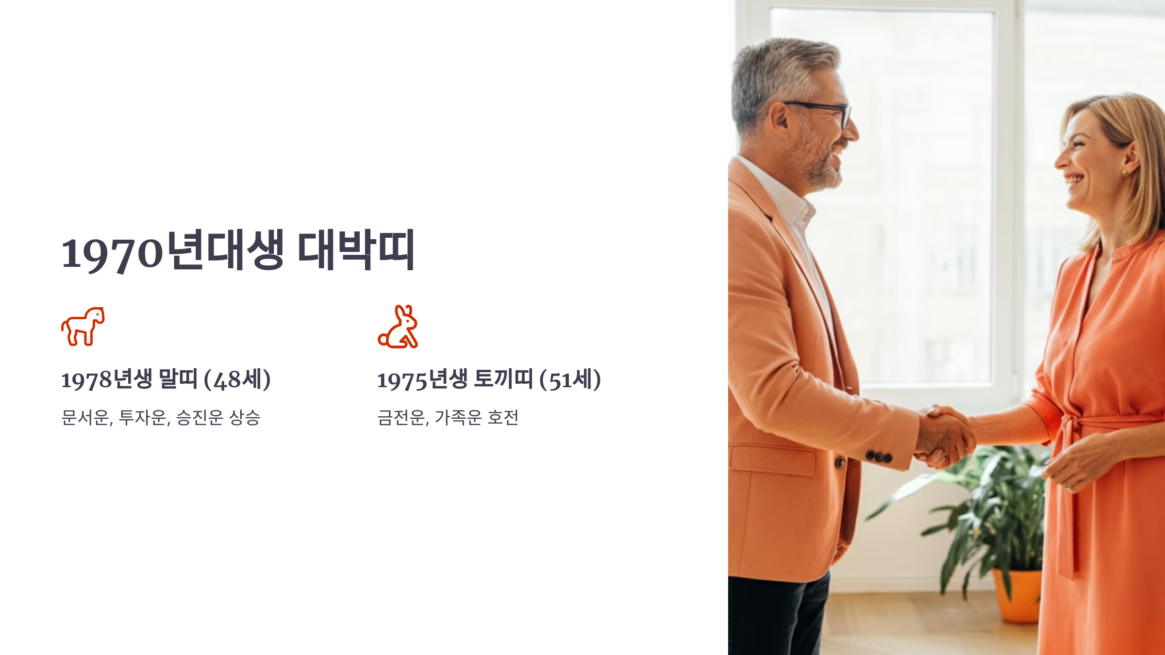 • 1978년생 말띠 (48세): 문서운, 투자운, 승진운이 좋습니다. 계획했던 일들을 실행에 옮길 좋은 시기입니다.