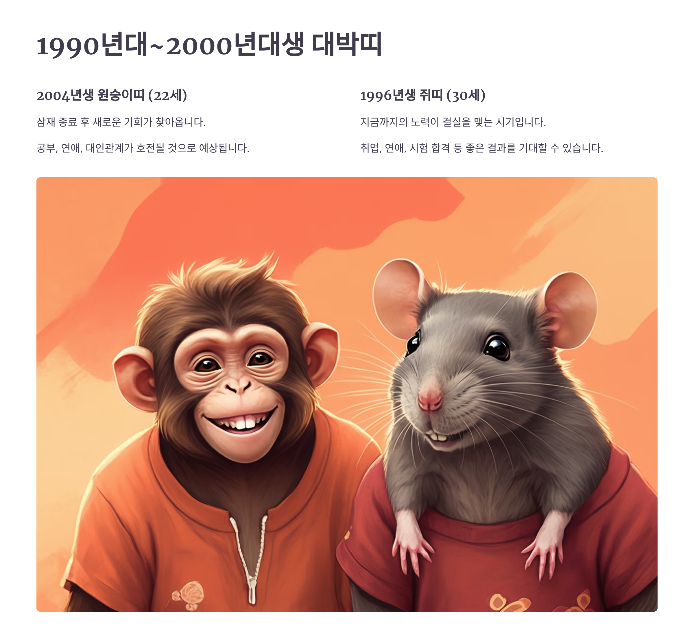 • 1996년생 쥐띠 (30세): 그동안의 노력이 결실을 맺기 시작합니다. 취업, 연애, 시험 합격 등 중요한 변화가 예상됩니다.