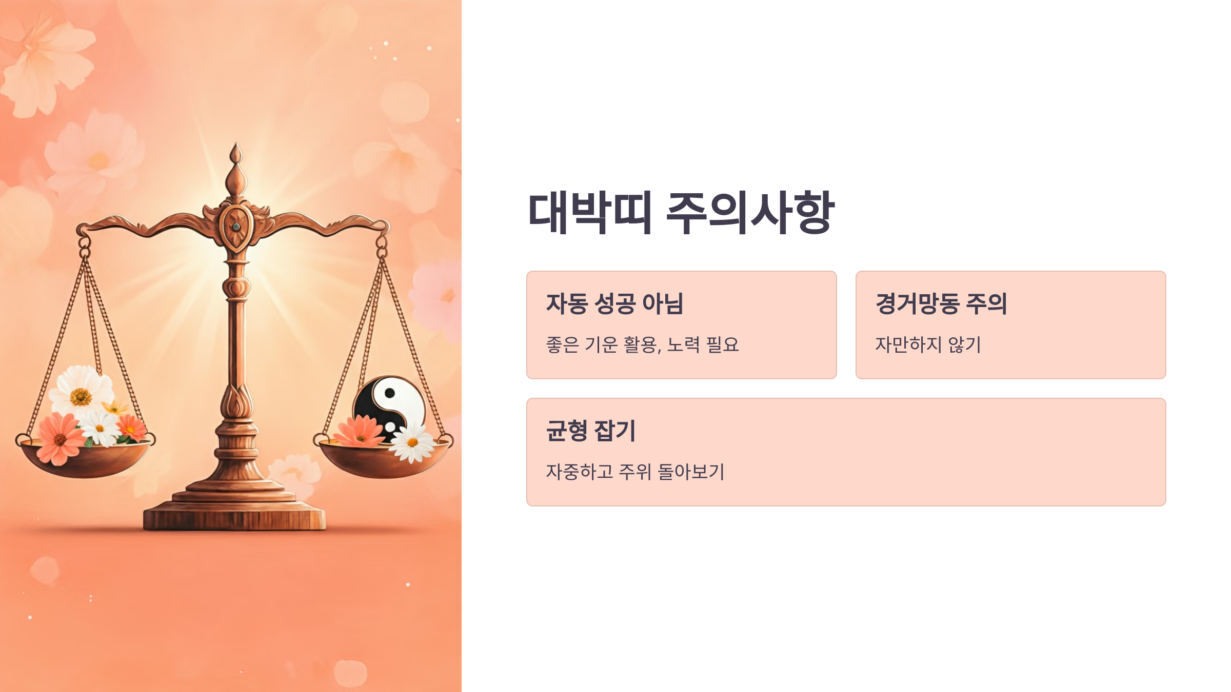 주의할 점은 대박띠라고 해서 모든 것이 저절로 이루어지는 것은 아닙니다. 좋은 기운을 잘 활용하되, 경거망동하거나 자만하지 않도록 주의해야 합니다. 항상 자중하고 주위를 돌아보는 자세가 필요합니다.