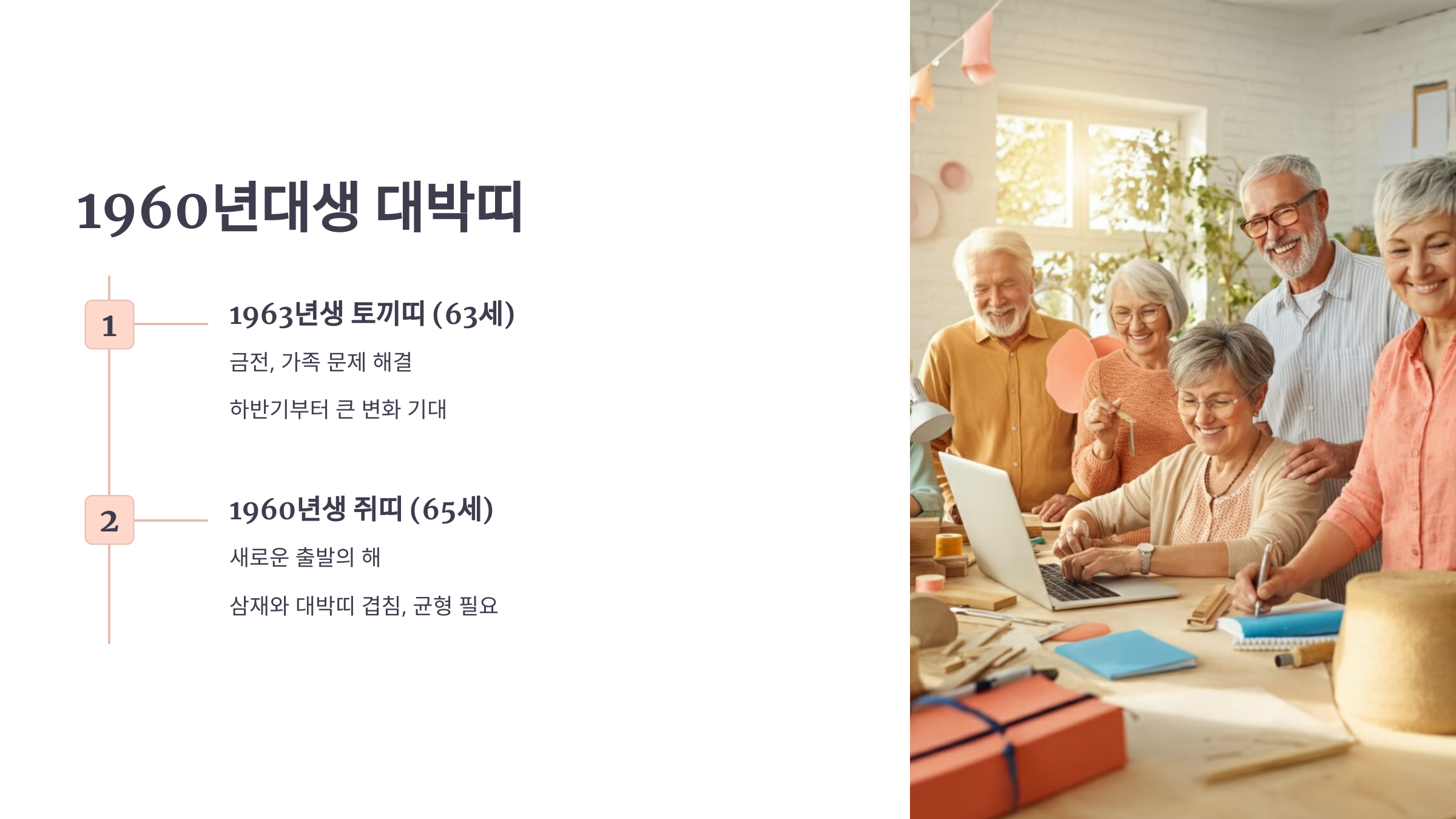 • 1960년생 쥐띠 (65세): 새로운 출발의 해가 될 것입니다. 삼재와 대박띠가 겹치므로 균형을 잘 잡아야 합니다.