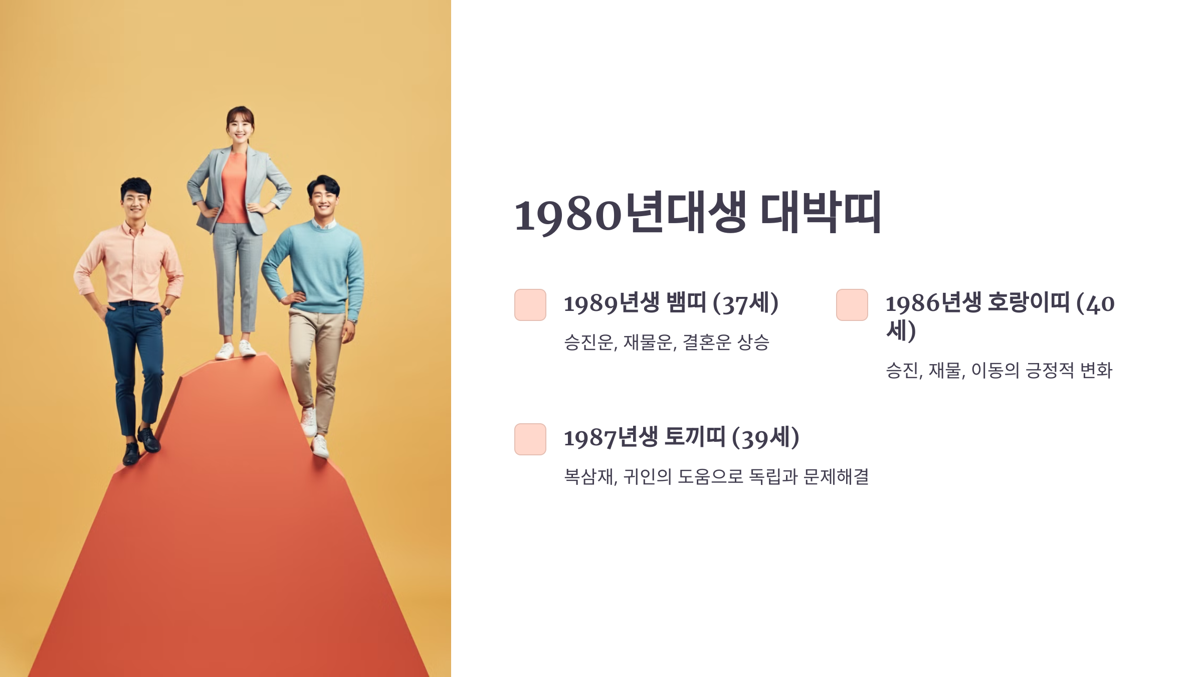 2025년 을사년에는 여러 띠들이 대박띠로 분류됩니다. 출생 연도와 2025년 기준 나이를 바탕으로 대박띠를 정리해보겠습니다.