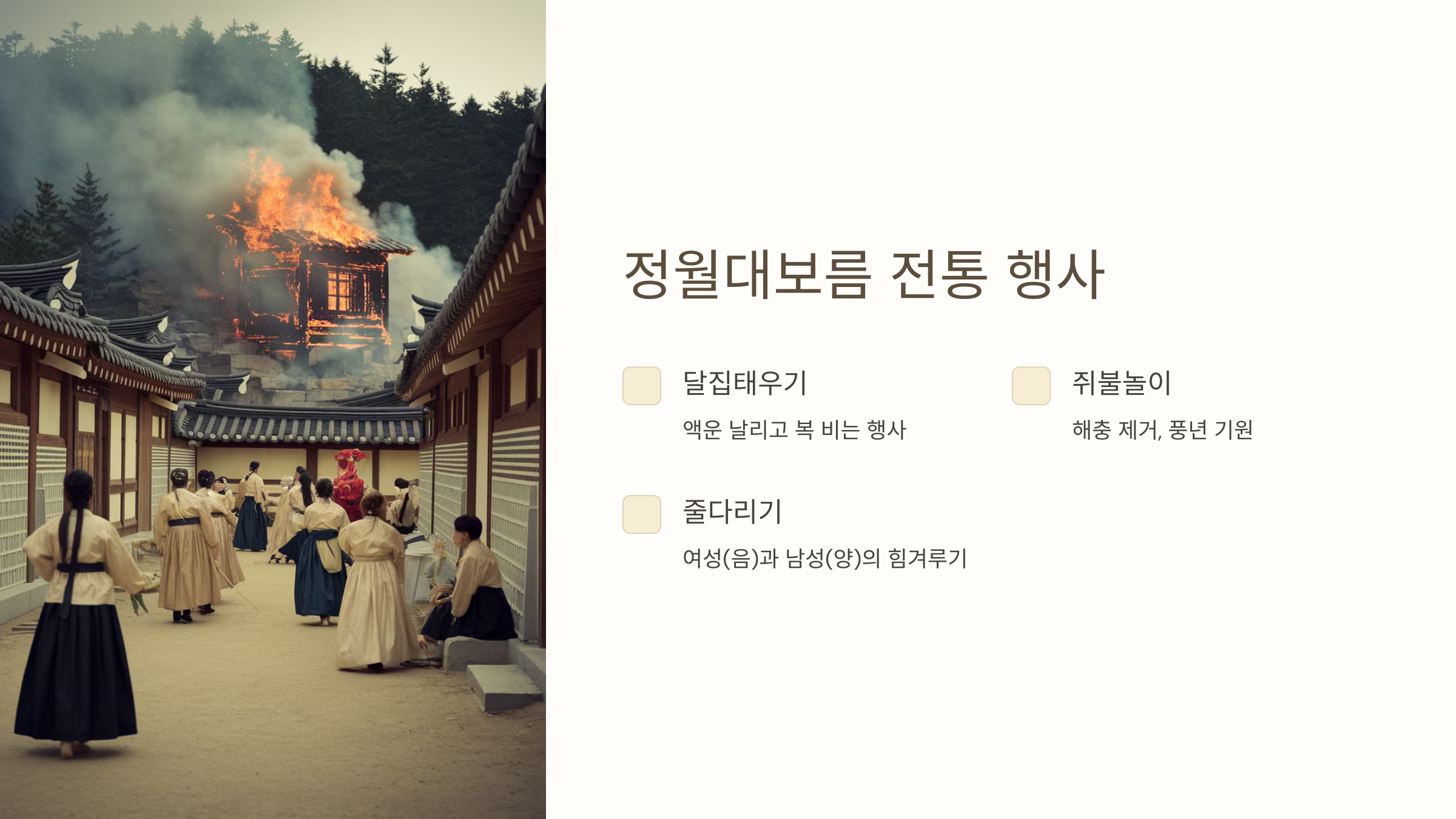 - 나무와 짚으로 만든 달집을 태우며, 액운을 날리고 복을 비는 행사입니다.