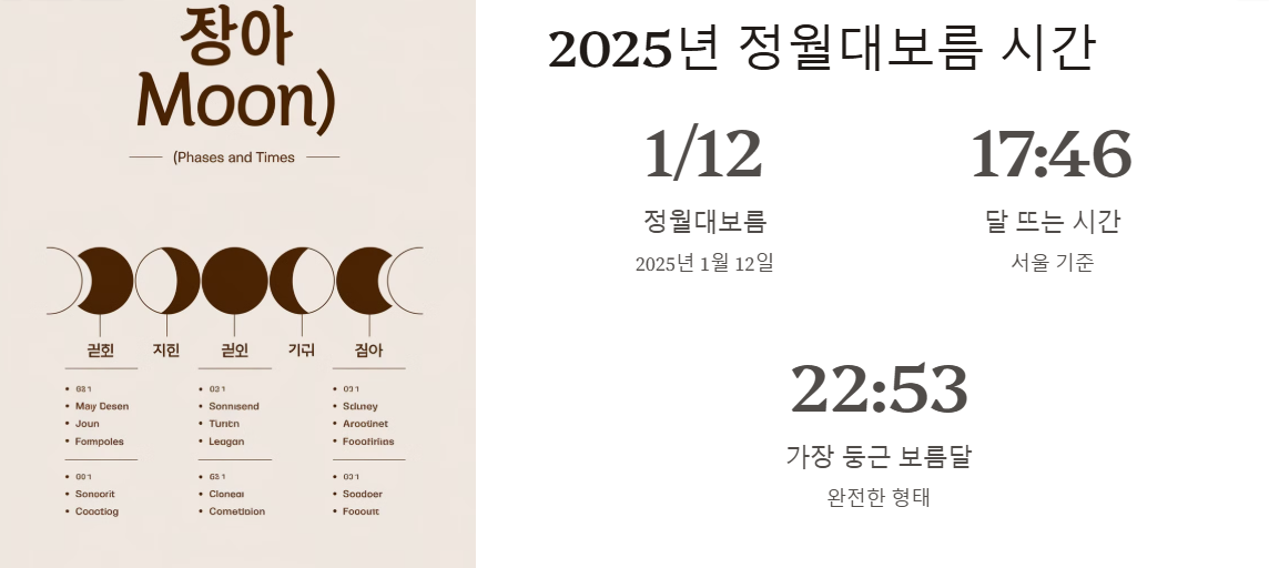 정월대보름(음력 1월 15일)은 2025년 1월 12일입니다. 이 날 달이 뜨는 시간과 가장 둥근 보름달을 볼 수 있는 시간을 알아두면 더욱 멋진 순간을 맞이할 수 있습니다.