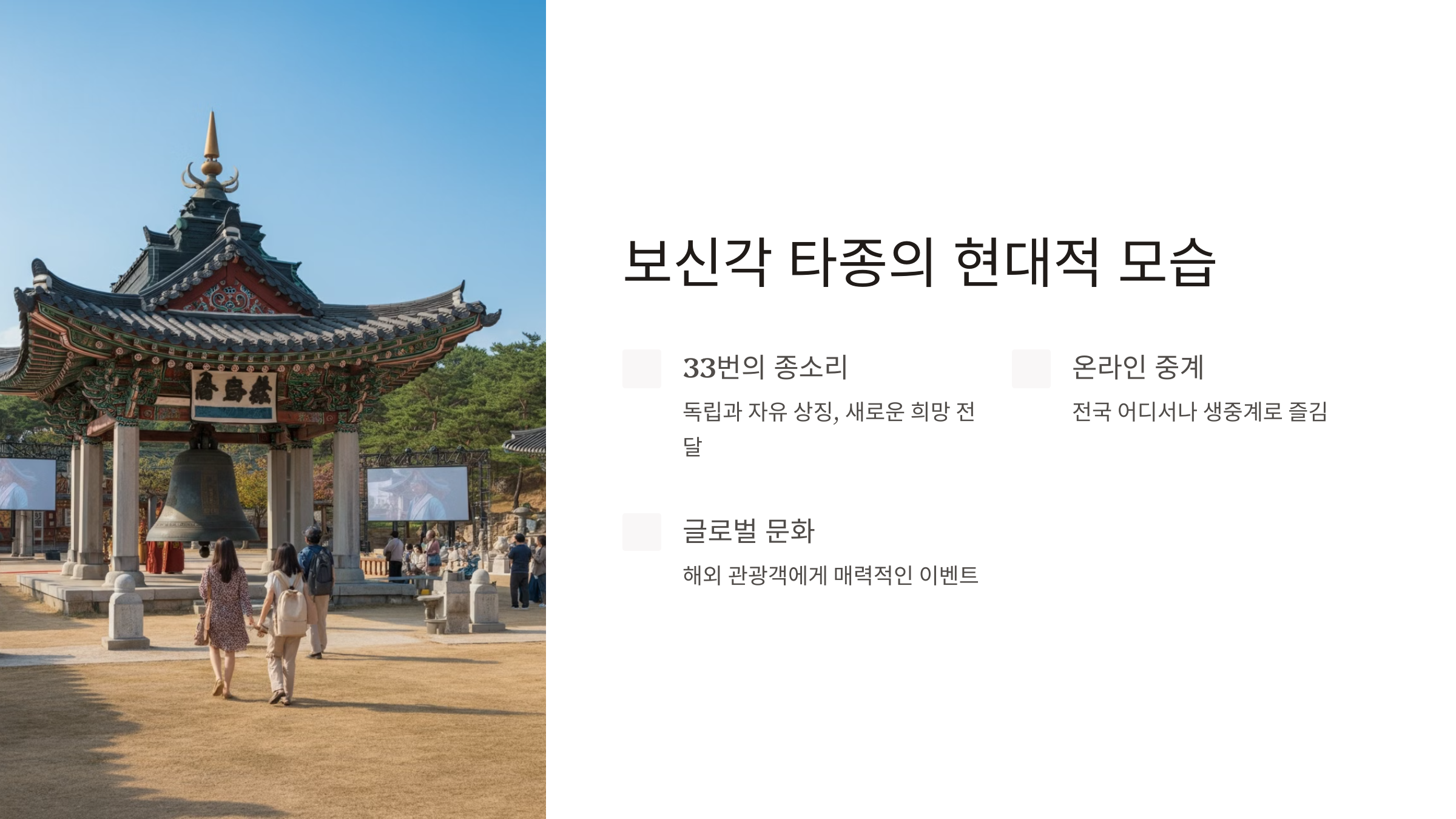 현대의 보신각 타종 행사는 전통적 의미를 유지하면서도, 기술과 대중문화를 결합하여 더 많은 이들이 즐길 수 있는 축제로 발전했습니다.