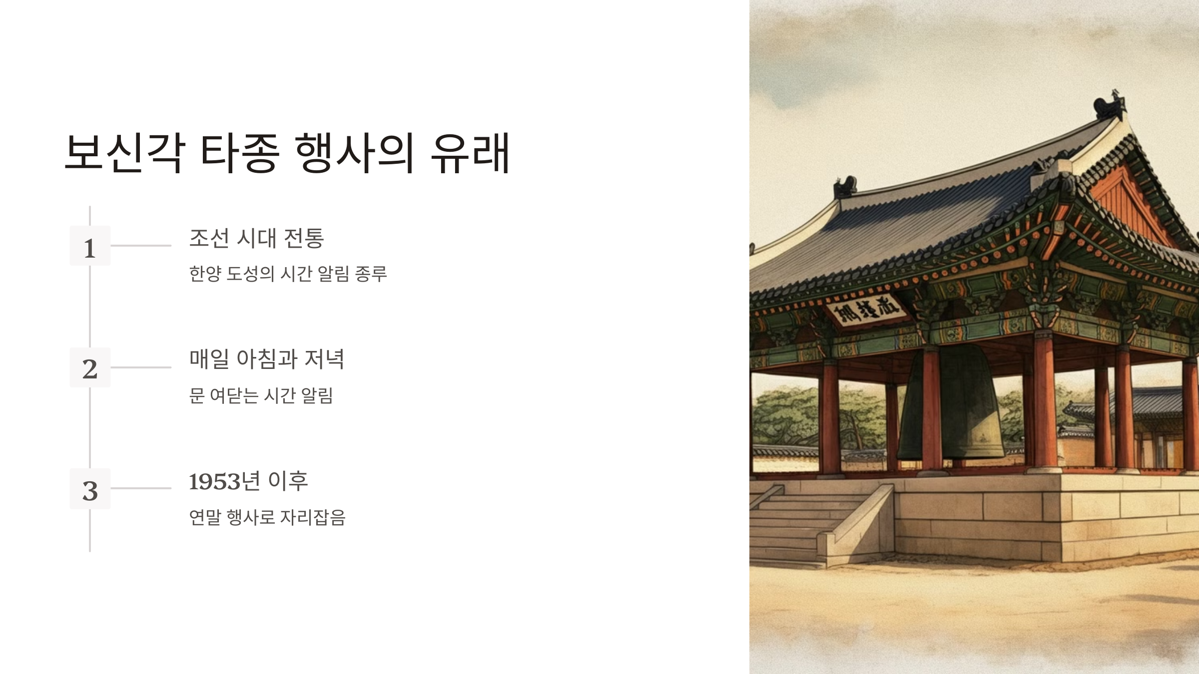 - 현대적 전환: 1953년 이후, 보신각 타종은 매년 12월 31일 자정에 울려 퍼지는 연말 행사로 자리 잡았습니다. 이는 전통을 계승하는 동시에 국민적인 연말 이벤트로 발전했습니다.