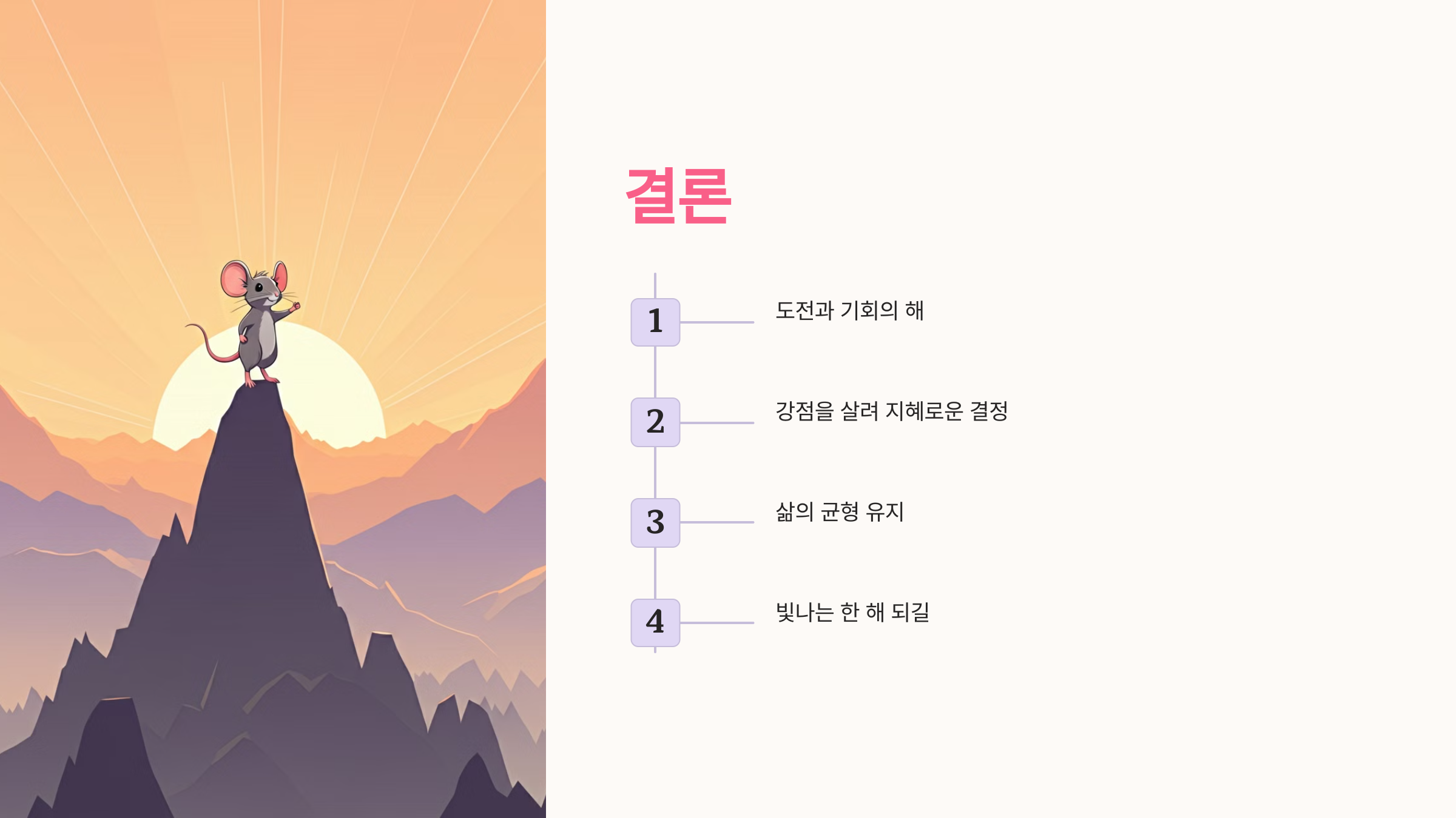 2025년은 쥐띠에게 도전과 기회의 해입니다. 자신의 강점을 살려 지혜롭게 결정을 내린다면, 멋진 성과를 얻을 수 있을 것입니다. 삶의 균형을 유지하며 즐겁고 희망찬 한 해를 보내시길 바랍니다. 쥐띠 여러분, 2025년이 여러분에게 가장 빛나는 해가 되기를 응원합니다! 🎉