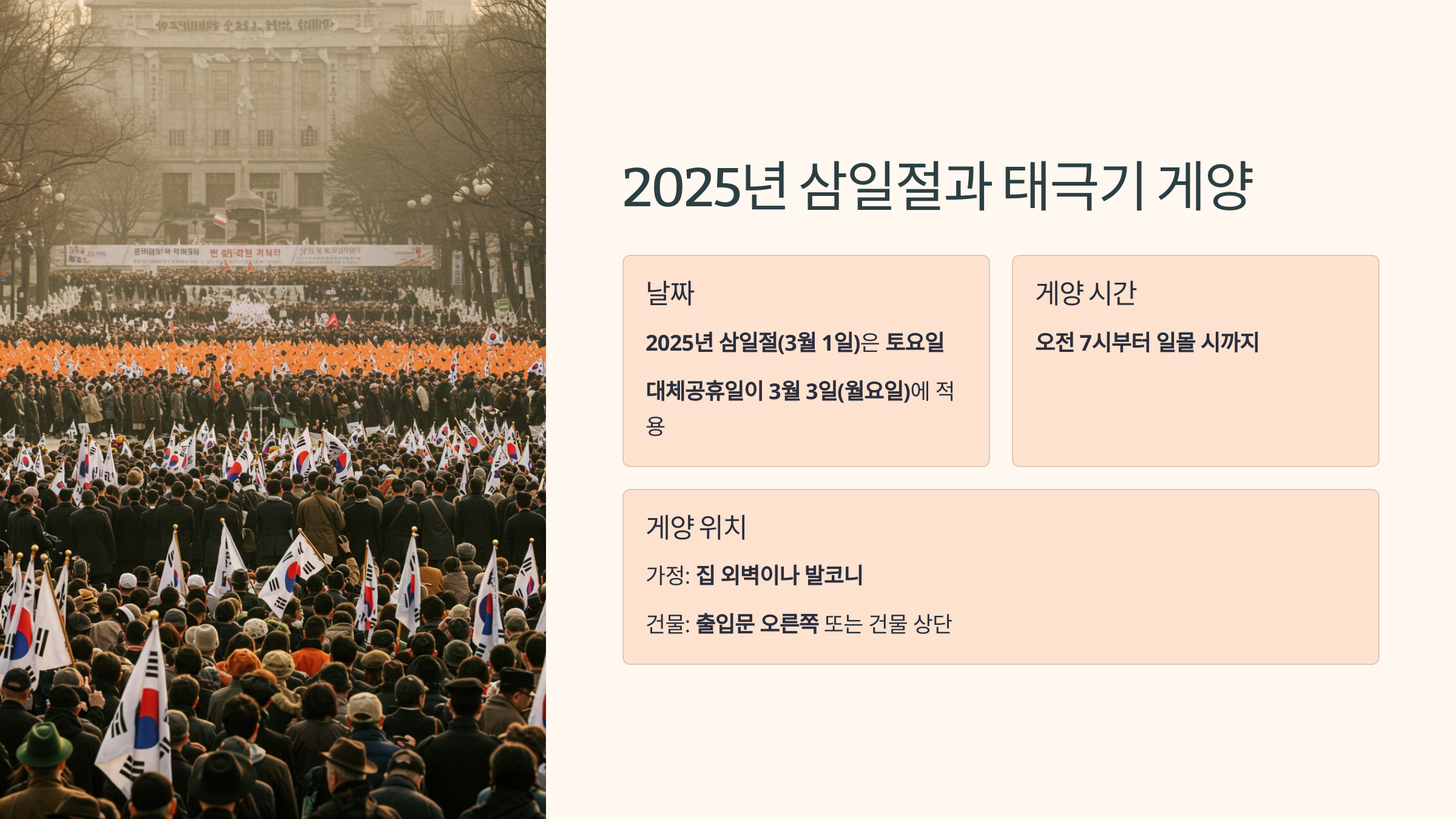 2025년 삼일절과 대체공휴일(3월 3일)을 맞아 태극기를 게양하며 애국심을 되새기고, 3일 연휴를 의미 있게 보내세요.