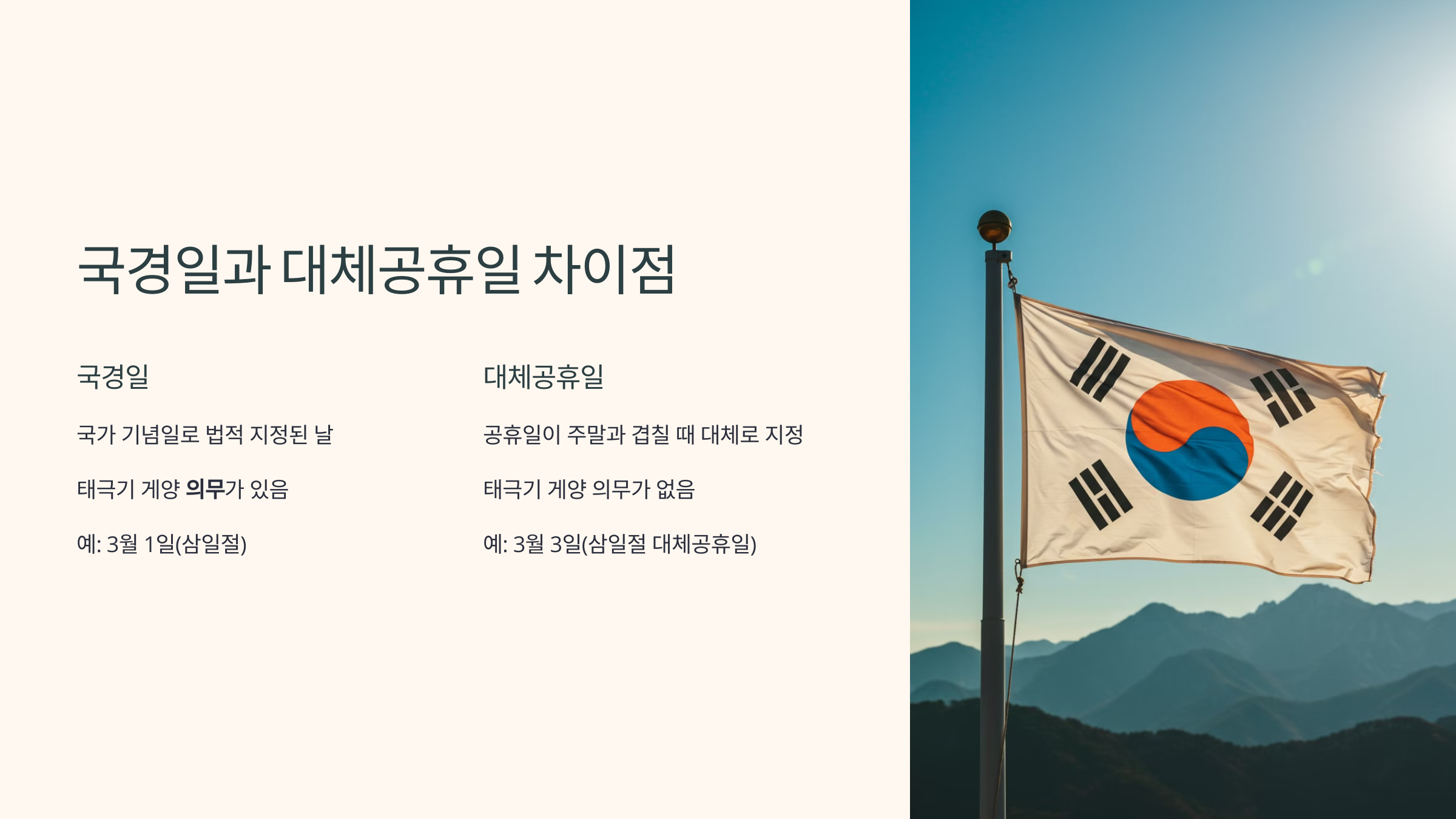 - 대체공휴일: 휴식 보장을 위한 제도로 태극기 게양 의무 없음