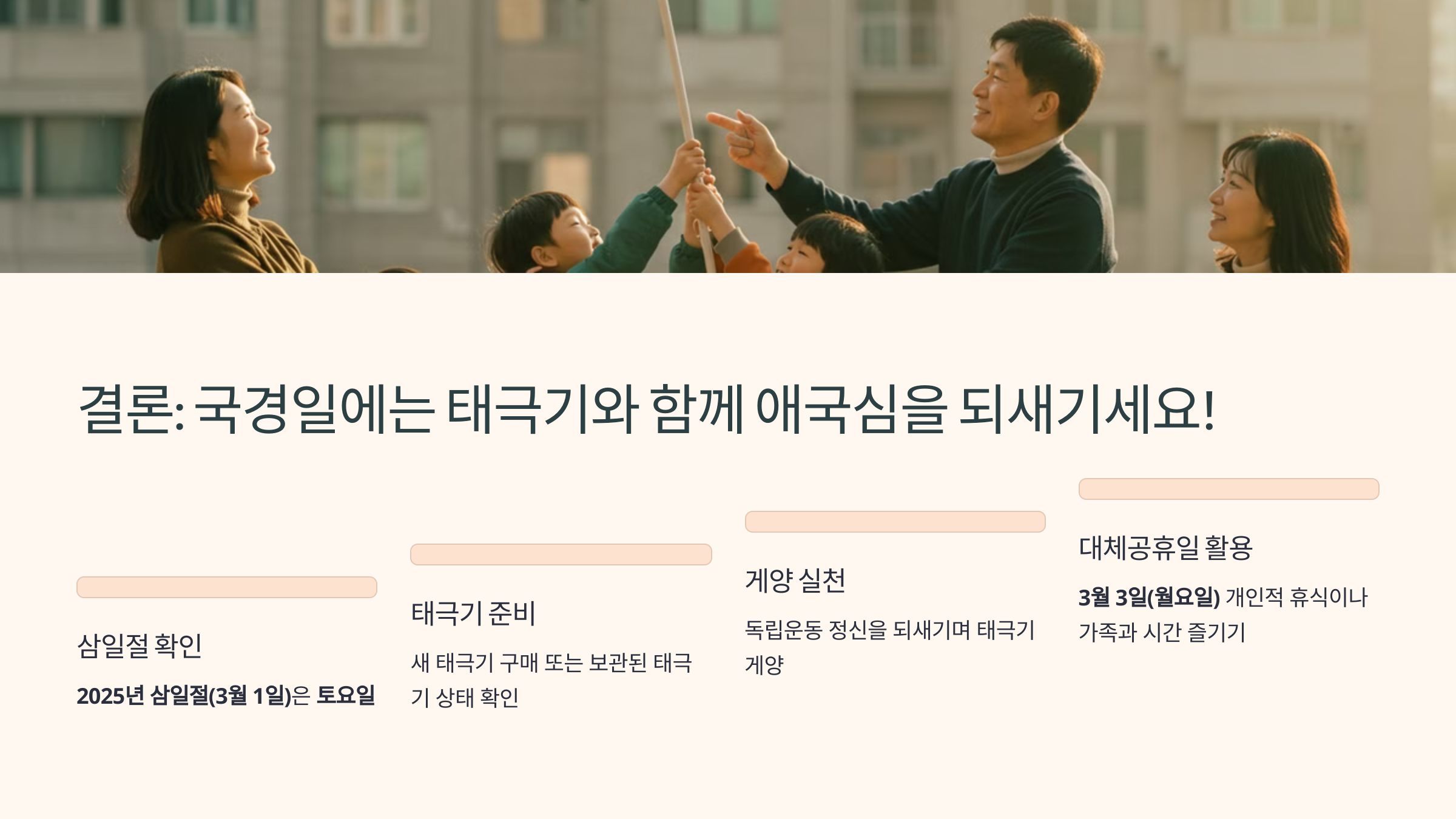 2025년 삼일절과 대체공휴일(3월 3일)을 맞아 태극기를 게양하며 애국심을 되새기고, 3일 연휴를 의미 있게 보내세요.
