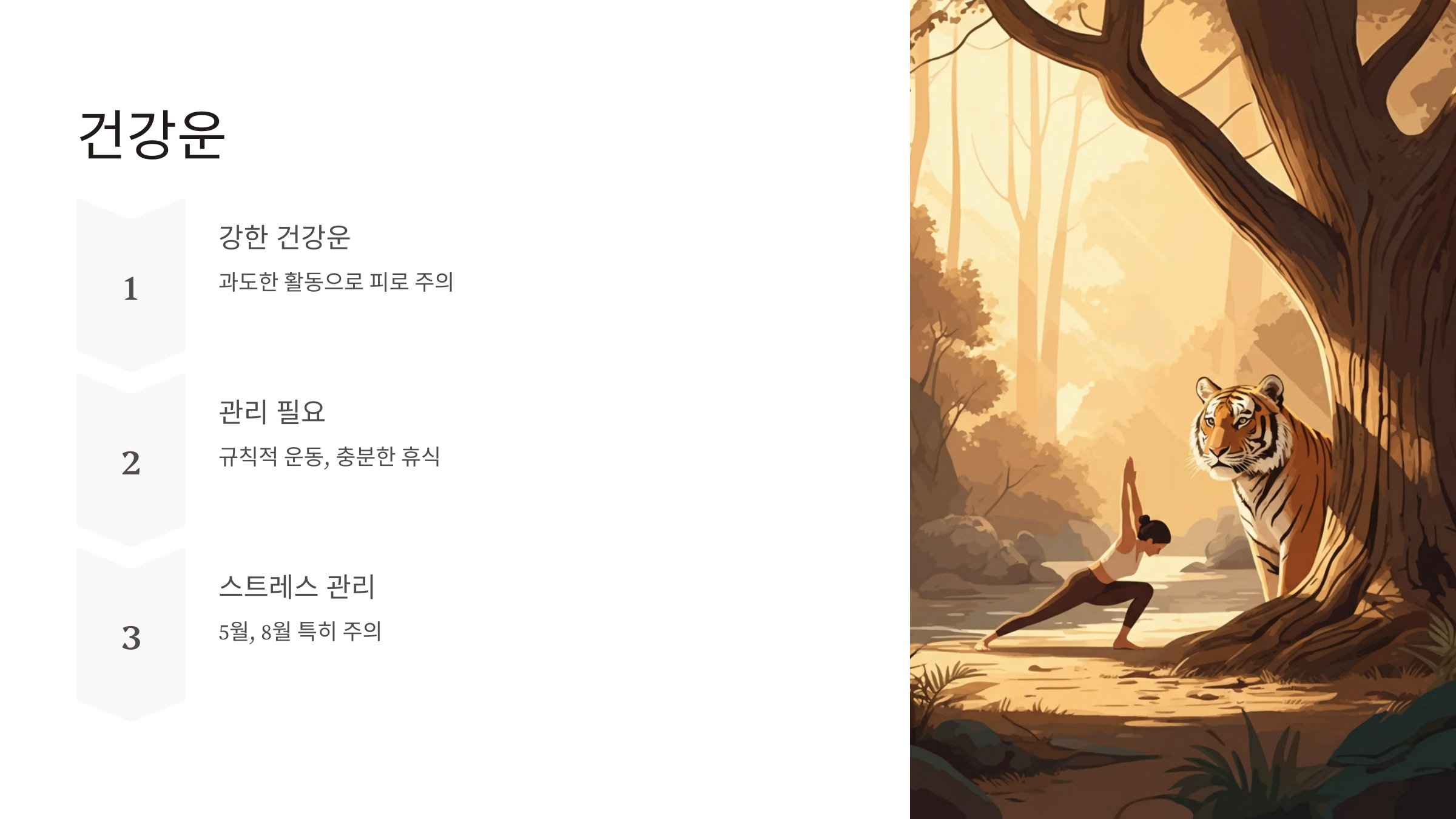 2025년은 호랑이띠의 건강운이 강하지만, 과도한 활동으로 피로가 쌓일 수 있습니다.