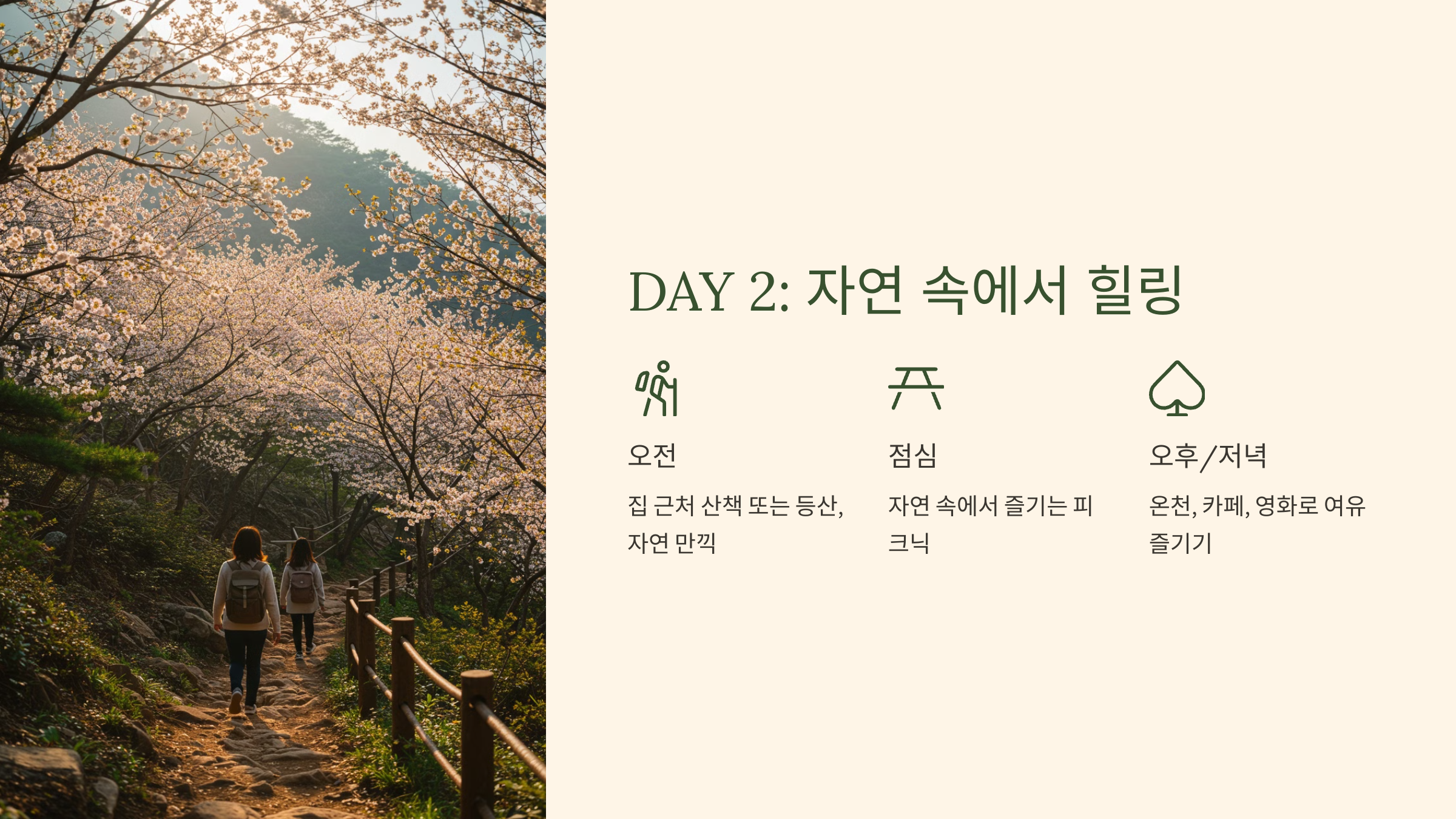 둘째 날은 완벽한 휴식을 위해 자연을 만끽해보세요. 봄이 시작되는 시기라 가벼운 외출이나 근교 여행으로 기분 전환하기 좋습니다.