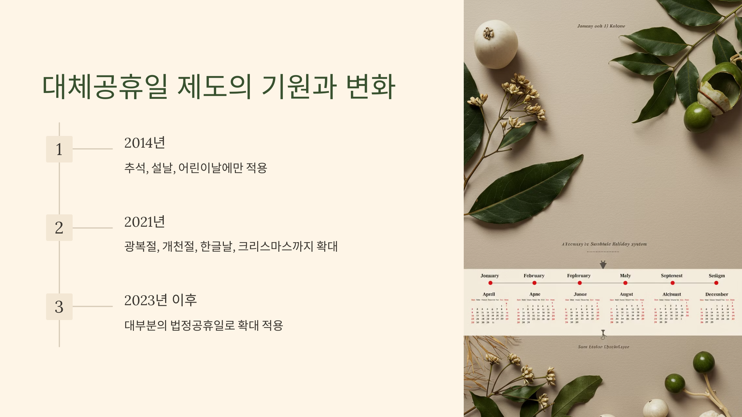 되었으며, 본격적으로 2014년 추석부터 시행되었습니다. 이후 국민적 요구와 사회 변화에 맞춰 적용 대상 공휴일이 점차 확대되었습니다.