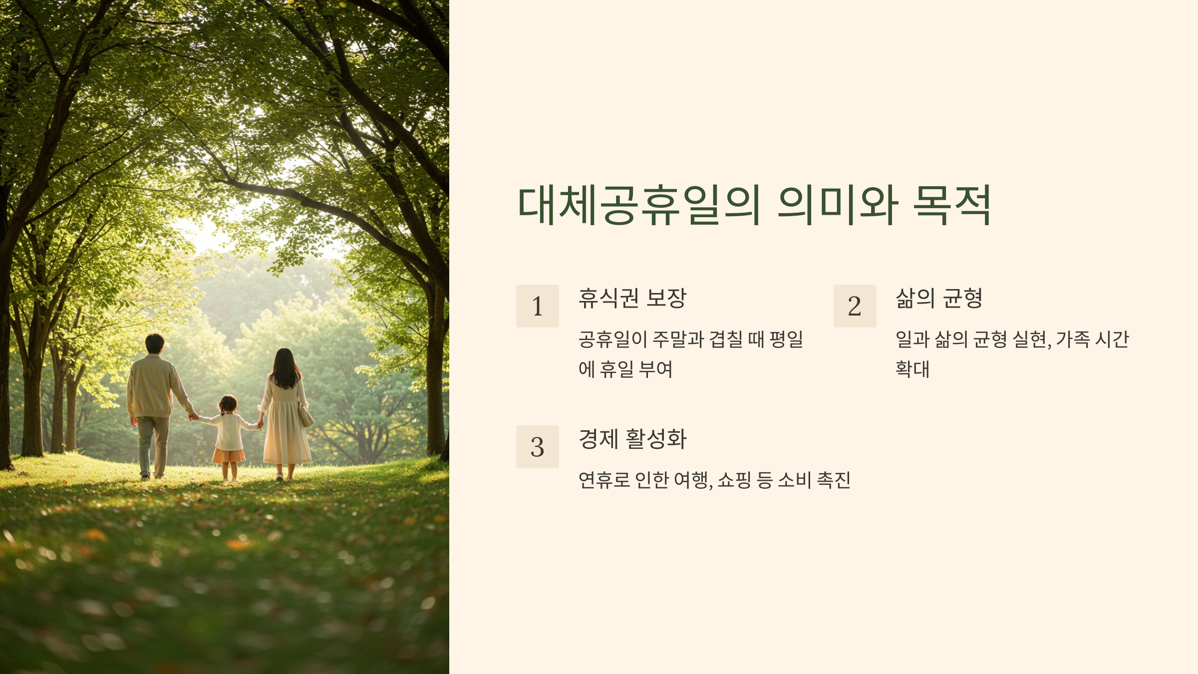 대체공휴일은 공휴일이 주말과 겹칠 때, 그 다음 평일에 휴일을 부여하는 제도입니다. 이는 국민이 충분한 휴식을 취할 수 있도록 보장하는 동시에, 연휴로 인한 여행, 쇼핑 등 소비 활동을 촉진해 내수 경기 활성화에 이바지합니다.