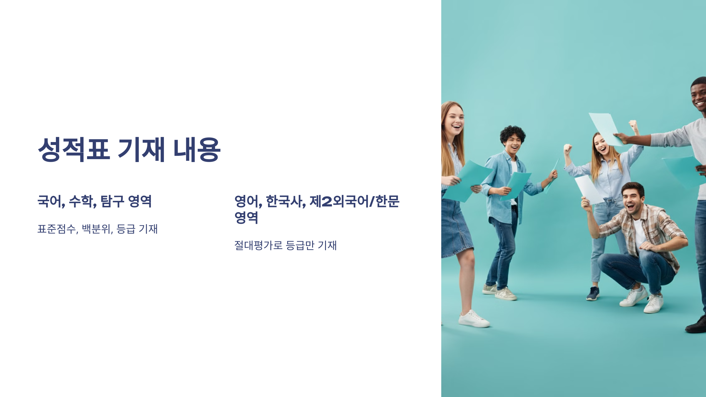 • 영어, 한국사, 제2외국어/한문 영역: 절대평가로 등급만 기재