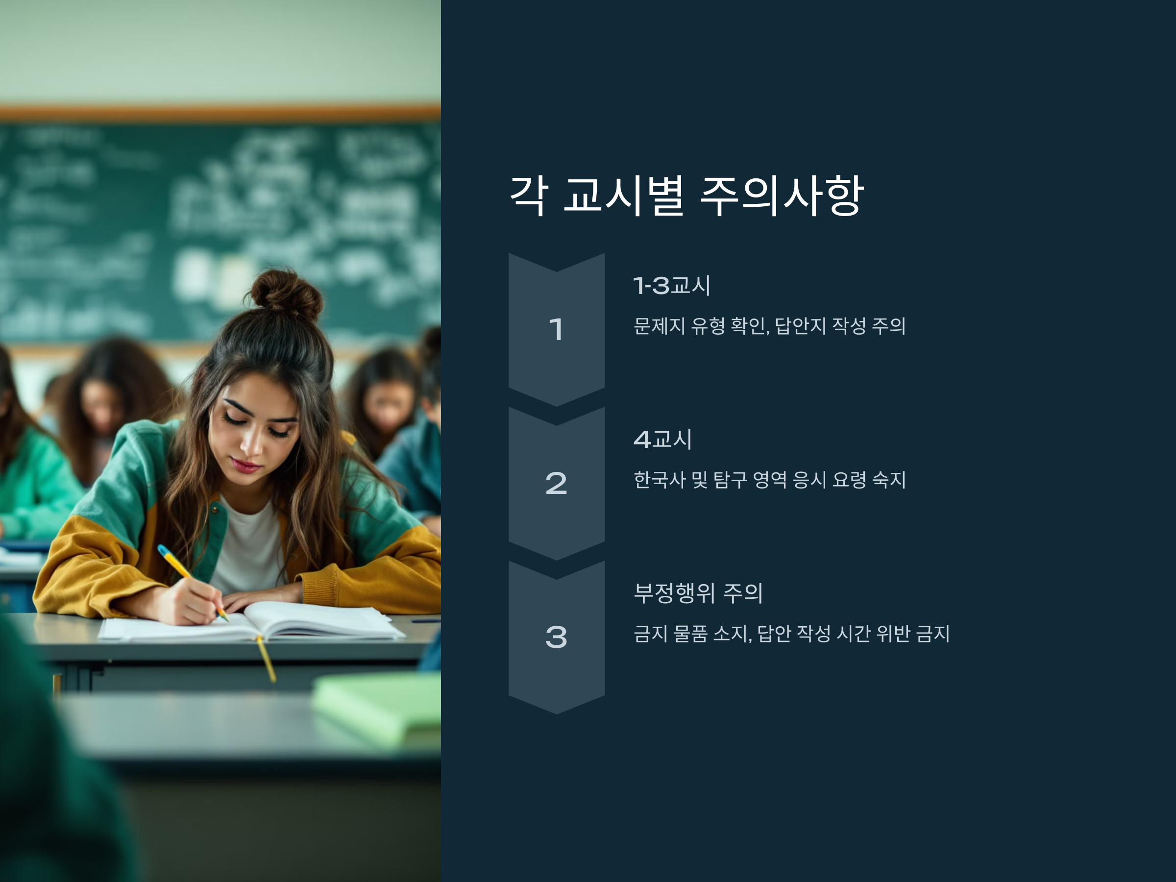 시험장 내에서는 수험생 간 대화나 자리를 이동하는 것이 제한되며, 점심은 개인 도시락을 지참해 자신의 자리에서 조용히 섭취해야 합니다. 시험실 내 시계가 없으므로 점심 후 오후 시험 시간 관리를 철저히 해야 합니다.
