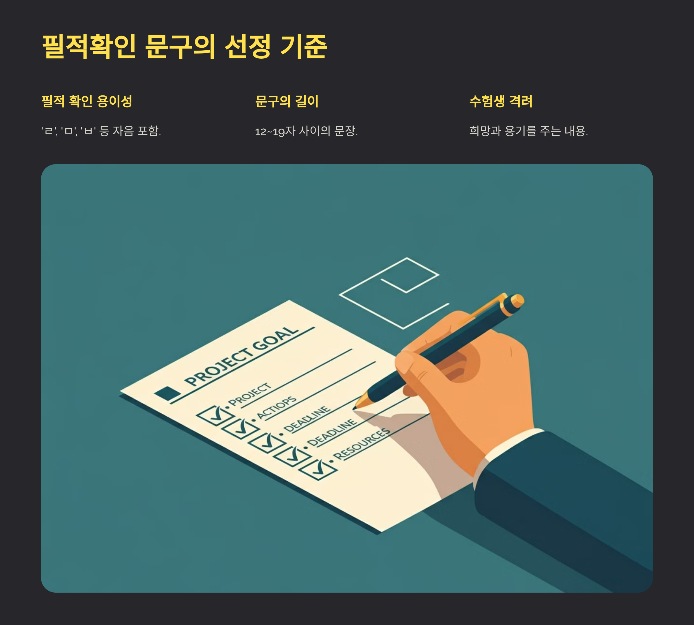 이러한 기준을 통해 매년 새로운 필적확인 문구가 선정되며, 수험생들에게 긍정적인 메시지를 전달합니다.
