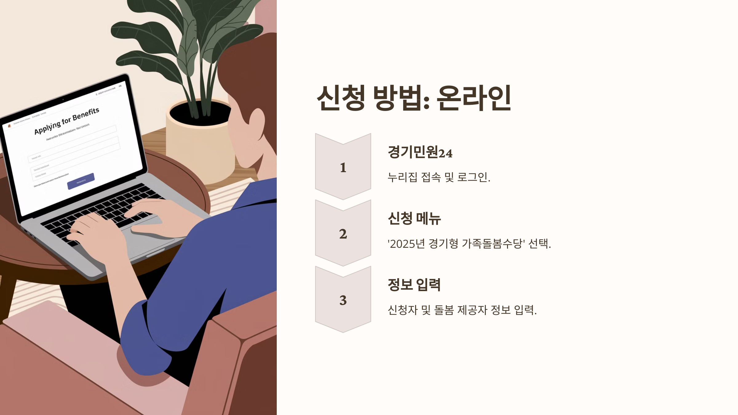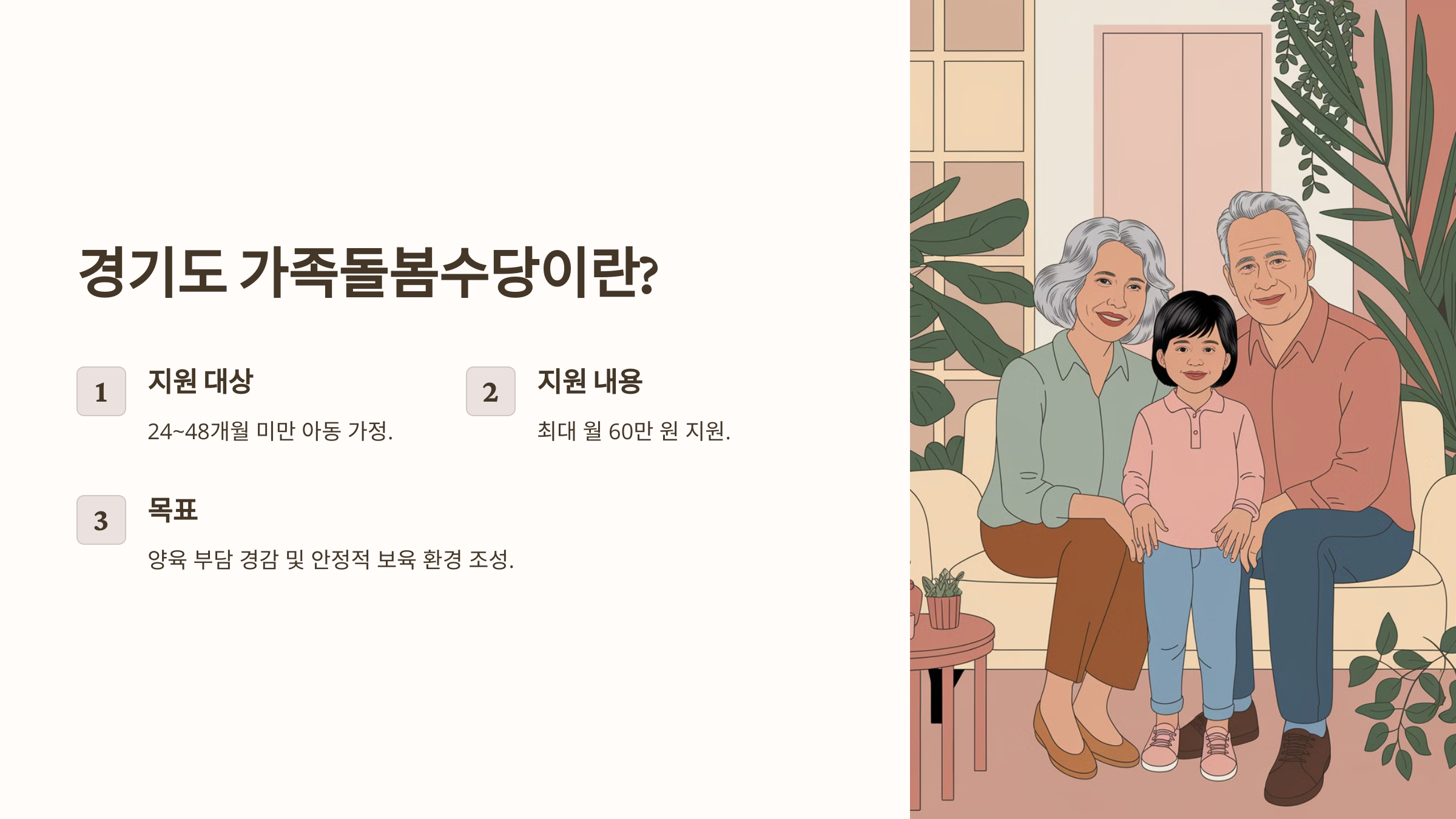 경기도 가족돌봄수당은 생후 24개월부터 48개월 미만의 아동을 둔 가정에서 양육 공백이 발생할 경우, 조부모 등 4촌 이내 친인척이나 이웃 주민이 아이를 돌봐주면 월 최대 60만 원까지 지원하는 제도입니다. 이를 통해 가정의 양육 부담을 경감하고 안정적인 보육 환경을 조성하고자 합니다.