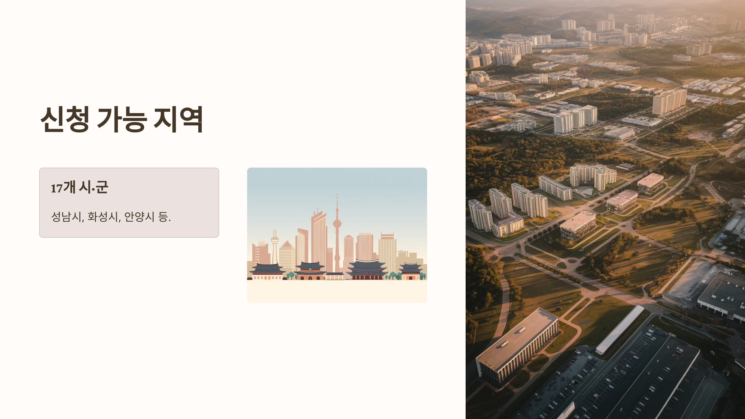 경기도 내 다음 17개 시·군에서 신청할 수 있습니다.