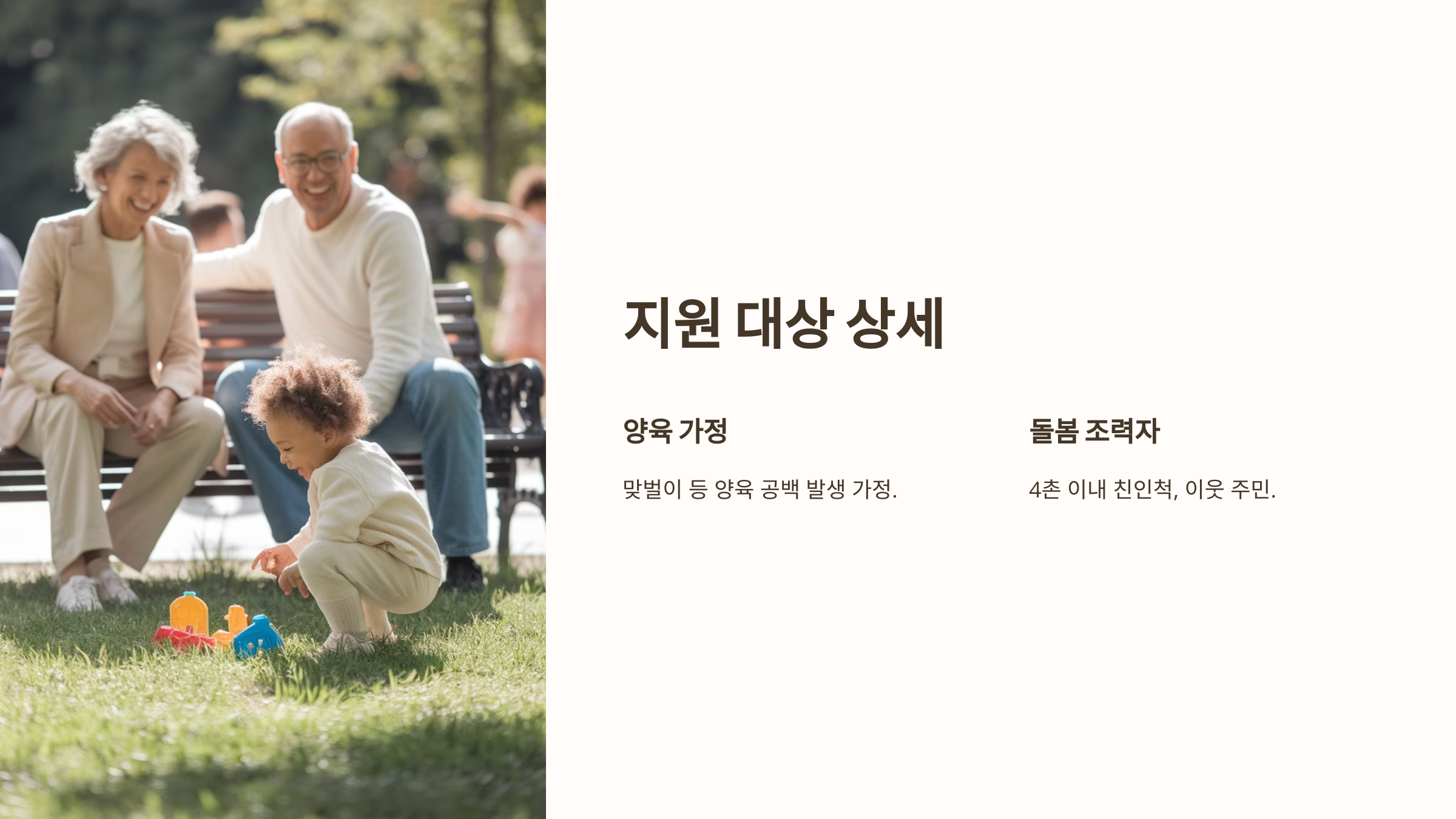 • 생후 24개월부터 48개월 미만의 아동이 있는 맞벌이 가정 등 양육 공백이 발생한 가정