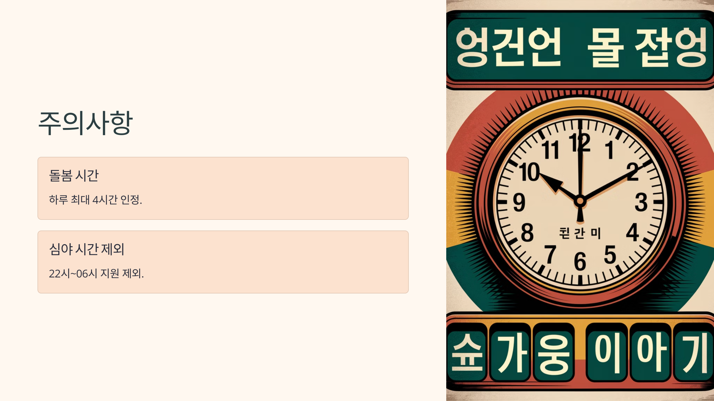 • 돌봄 활동은 평일, 주말, 공휴일 포함 하루 최대 4시간까지 인정됩니다.