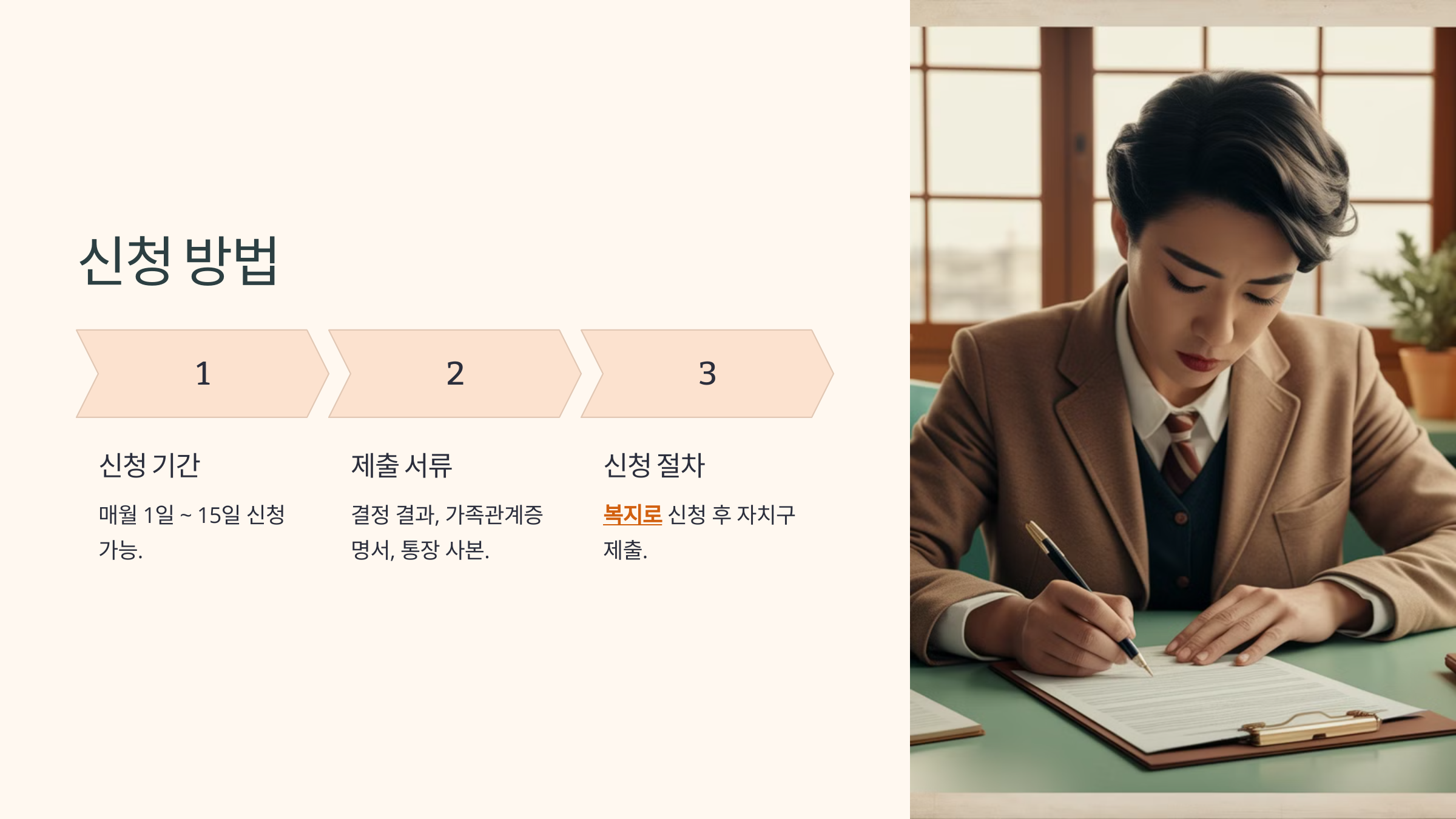1. 관할 동 주민센터 방문 후 신청서 작성 및 제출