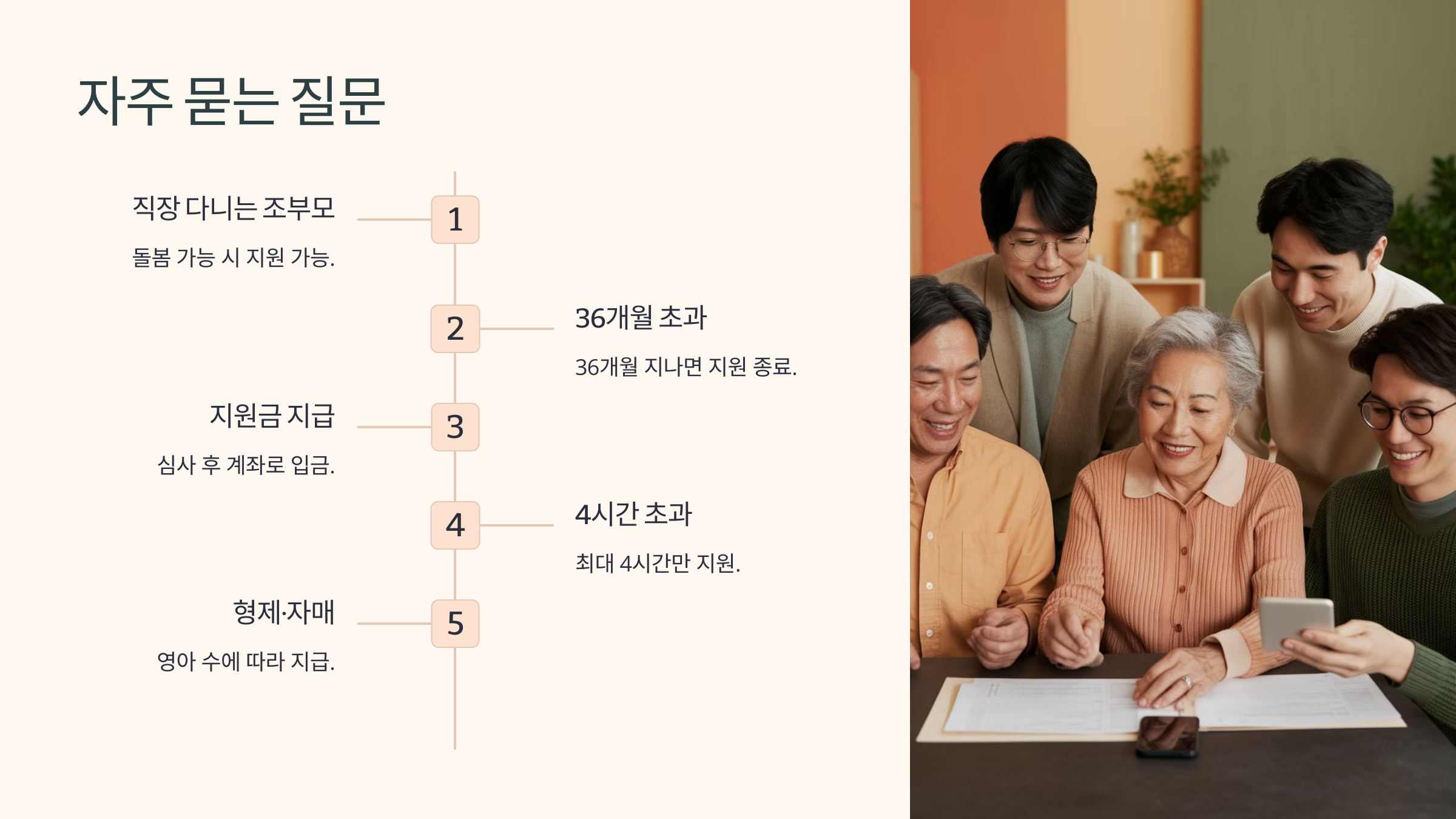 A1. 조부모가 직장에 다니고 있어도 일정 시간 손주를 돌보는 것이 가능하다면 지원을 받을 수 있습니다. 단, 실제 돌봄 시간이 인정되어야 합니다.