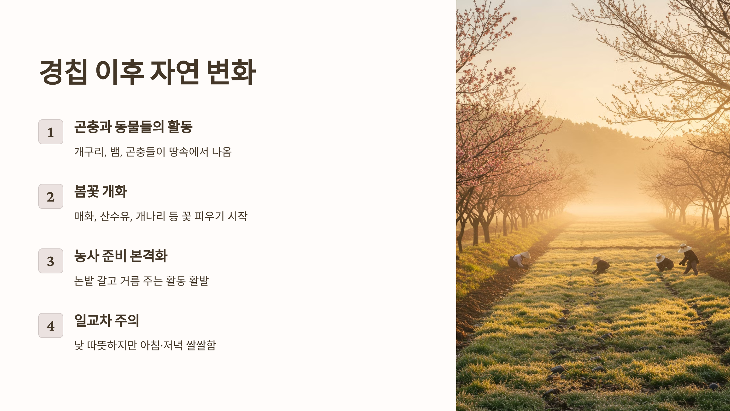 경칩은 단순한 24절기 중 하나가 아니라, 자연의 순환과 인간의 삶이 밀접하게 연결된 중요한 시기입니다. 겨울잠을 자던 곤충과 동물들이 깨어나고, 농경 사회에서는 농사 준비가 본격적으로 시작됩니다.