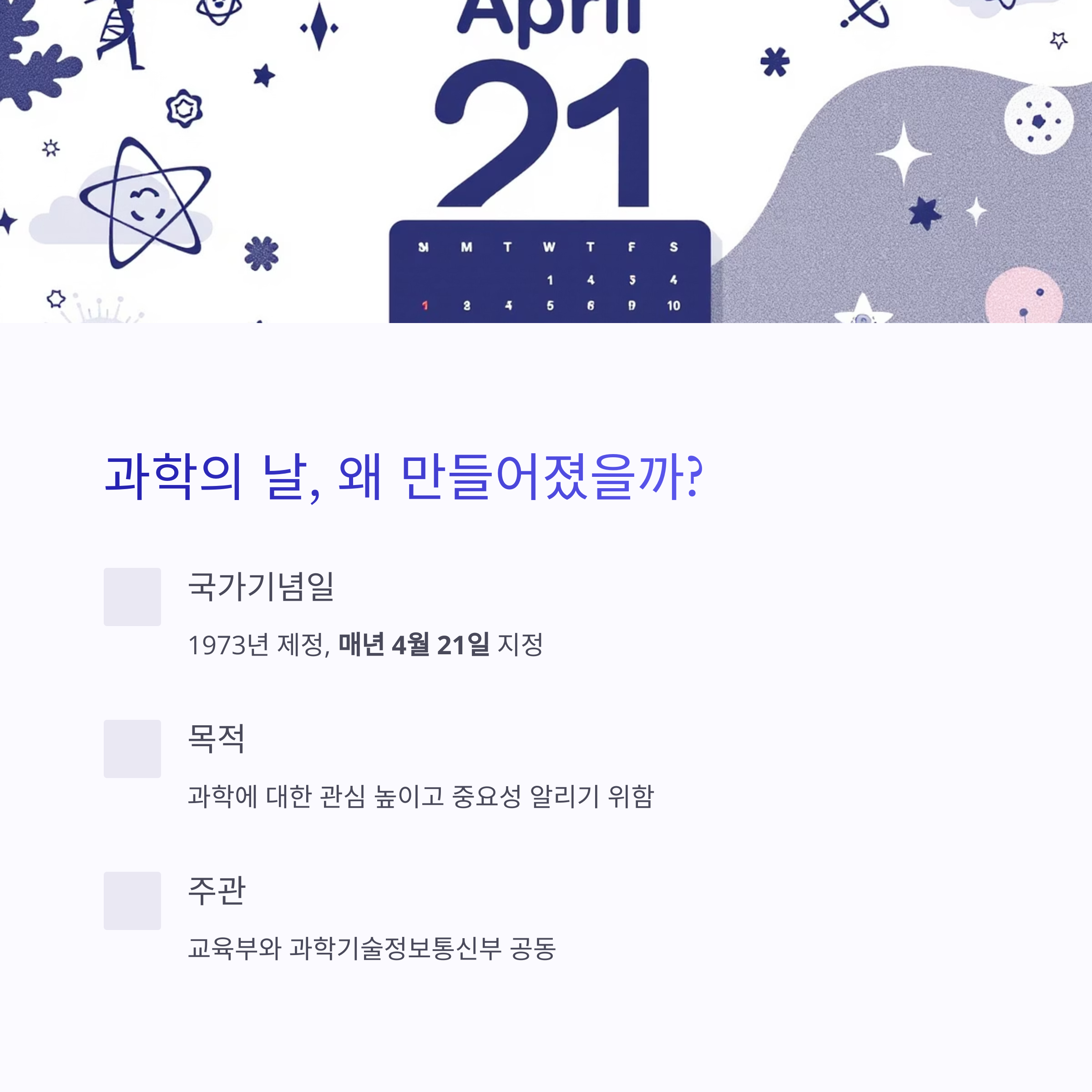 이런 인식을 바꾸고, 과학의 가치를 알리고 대중과 과학 사이의 거리를 좁히기 위해 제정된 기념일이 바로 과학의 날(4월 21일)입니다.