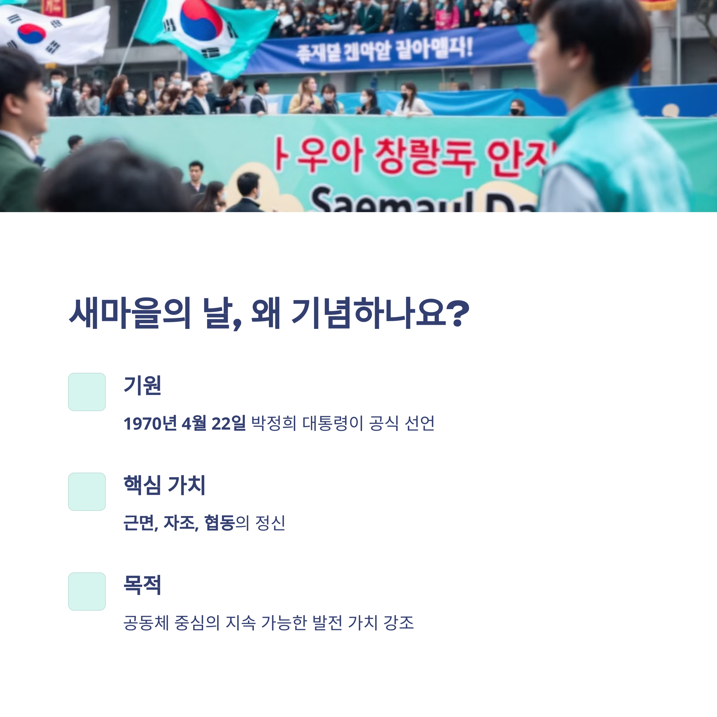 새마을의 날은 1970년 4월 22일, 당시 박정희 대통령이 ‘근면, 자조, 협동’을 핵심 가치로 제시한 새마을운동을 공식적으로 선언한 날입니다.