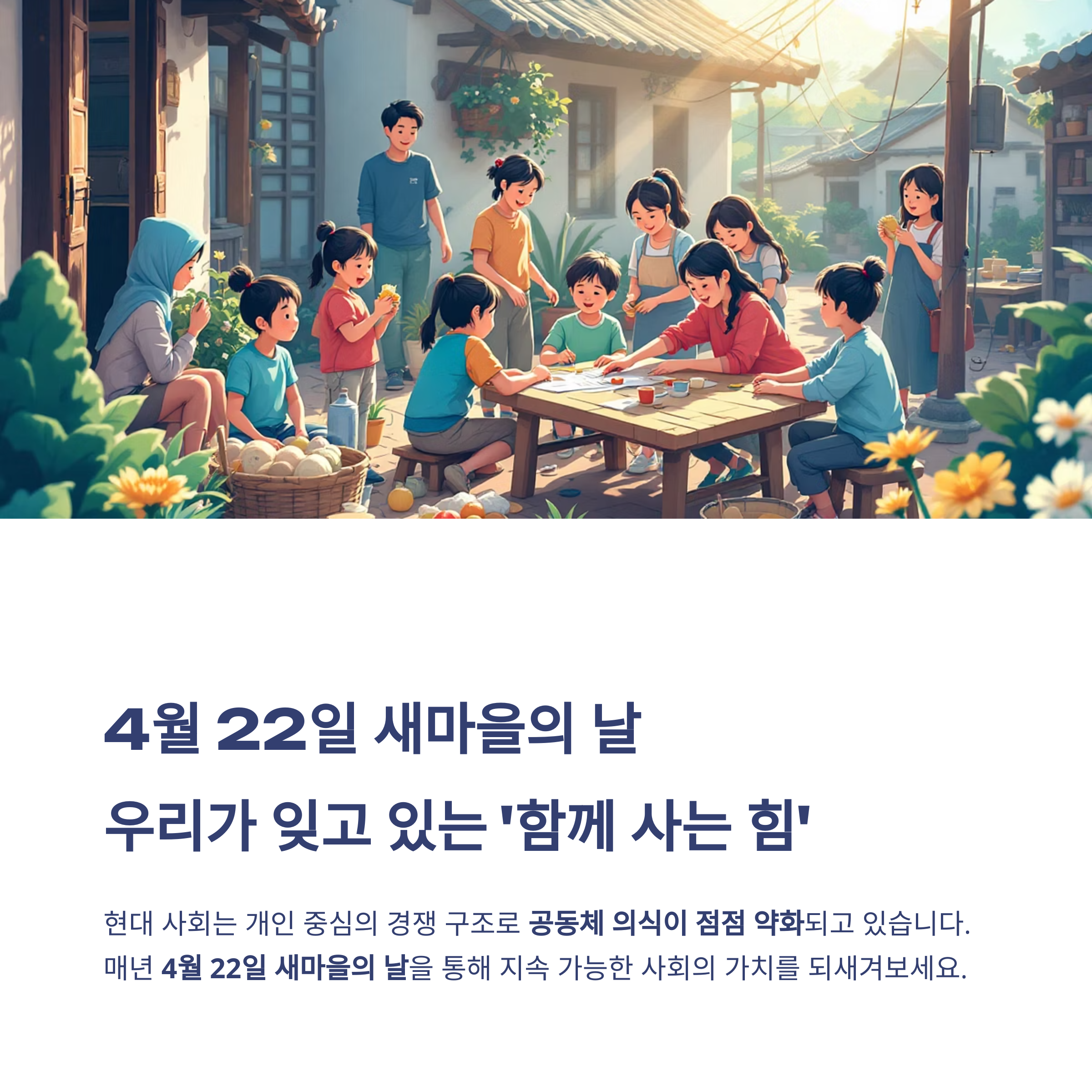 매년 4월 22일은 새마을의 날입니다. 이 날은 단순히 과거의 운동을 기념하는 날이 아니라, 지속 가능한 사회, 공동체 중심 발전의 가치를 되새기는 날로 자리 잡고 있습니다.