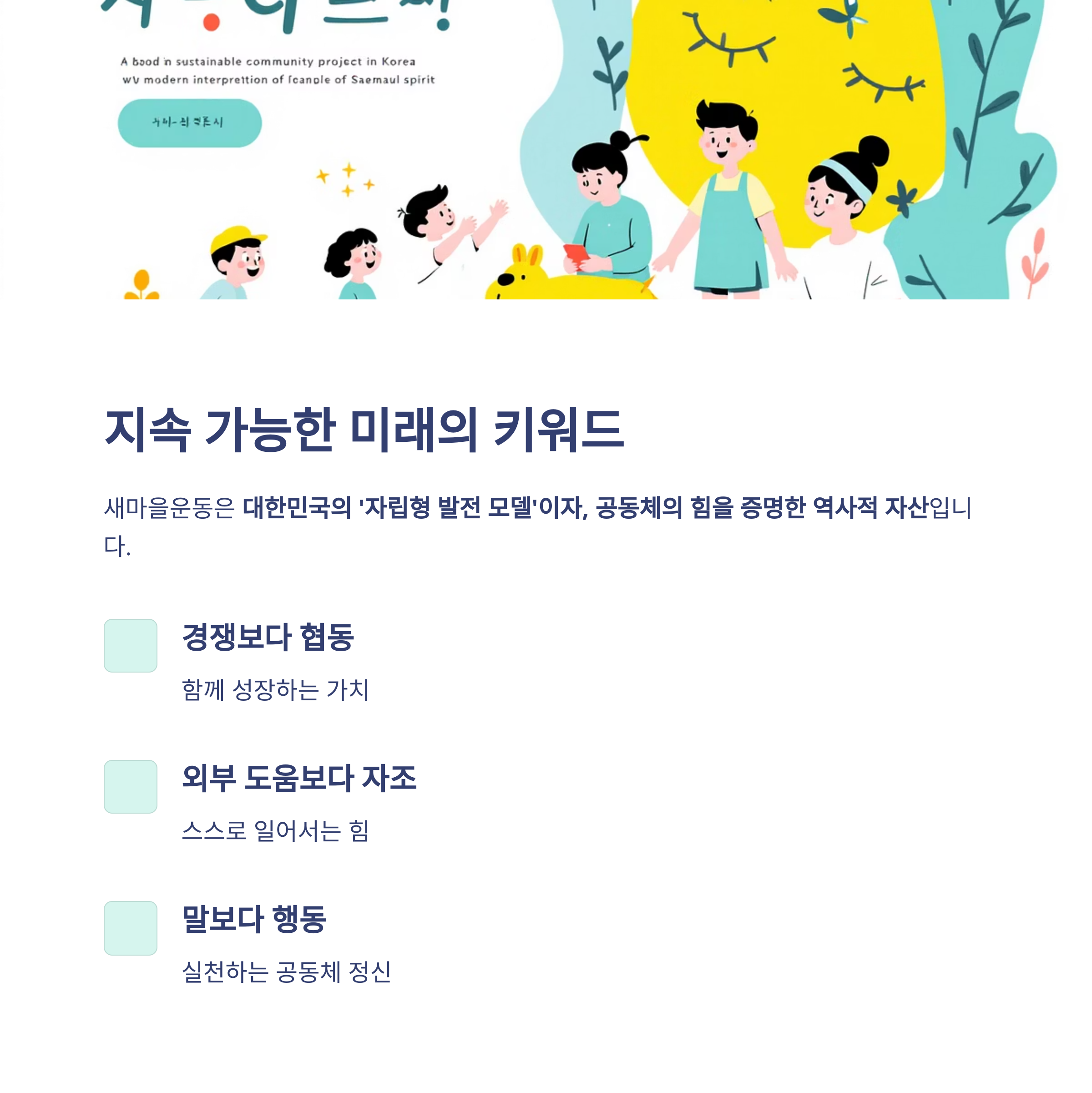 - 공동체 중심의 지속 가능한 발전 가치 강조